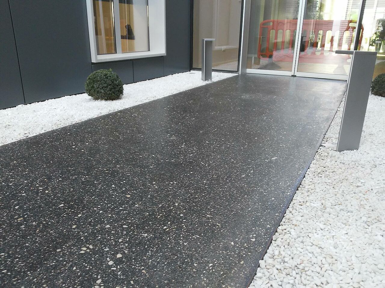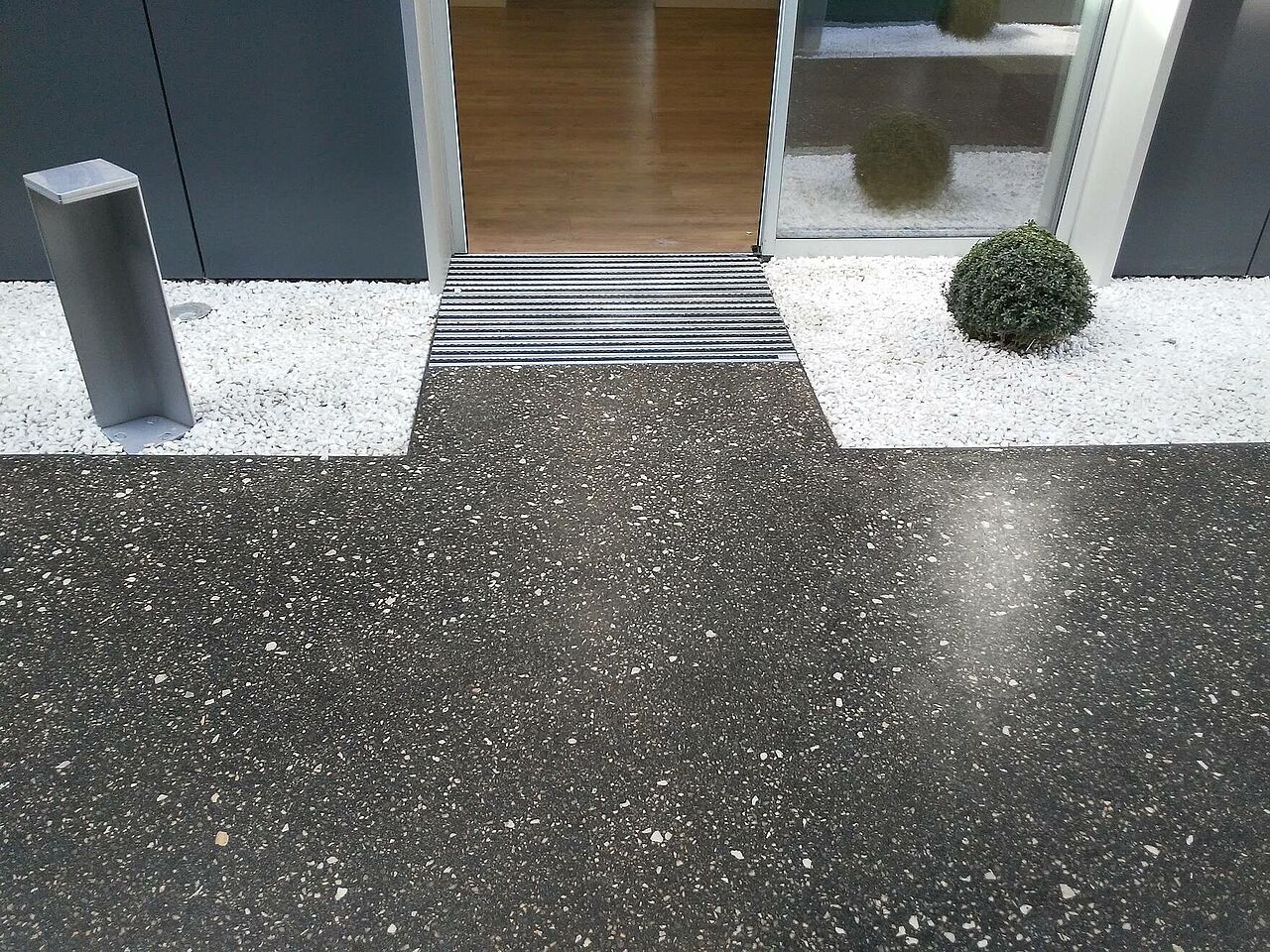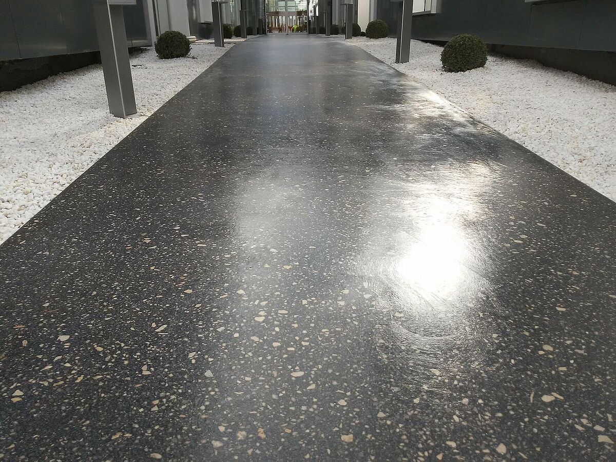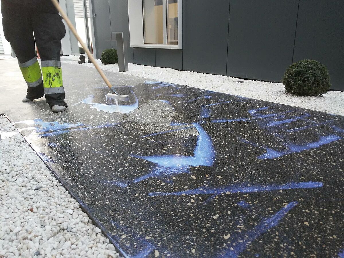 En éste caso, al asfalto extendido días antes, se le ha realizado un tratamiento superficial para conseguir un efecto mojado dotando de mayor belleza al pavimento.