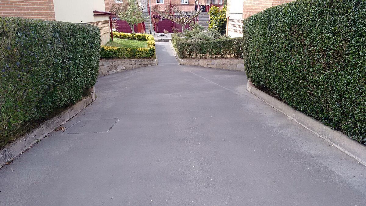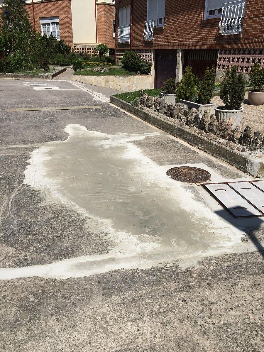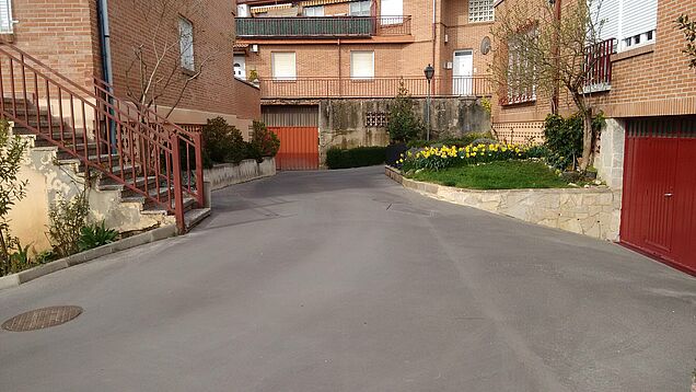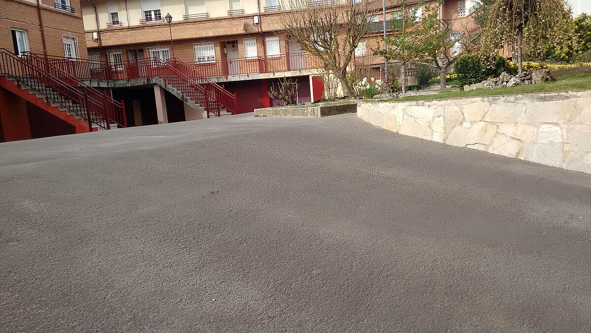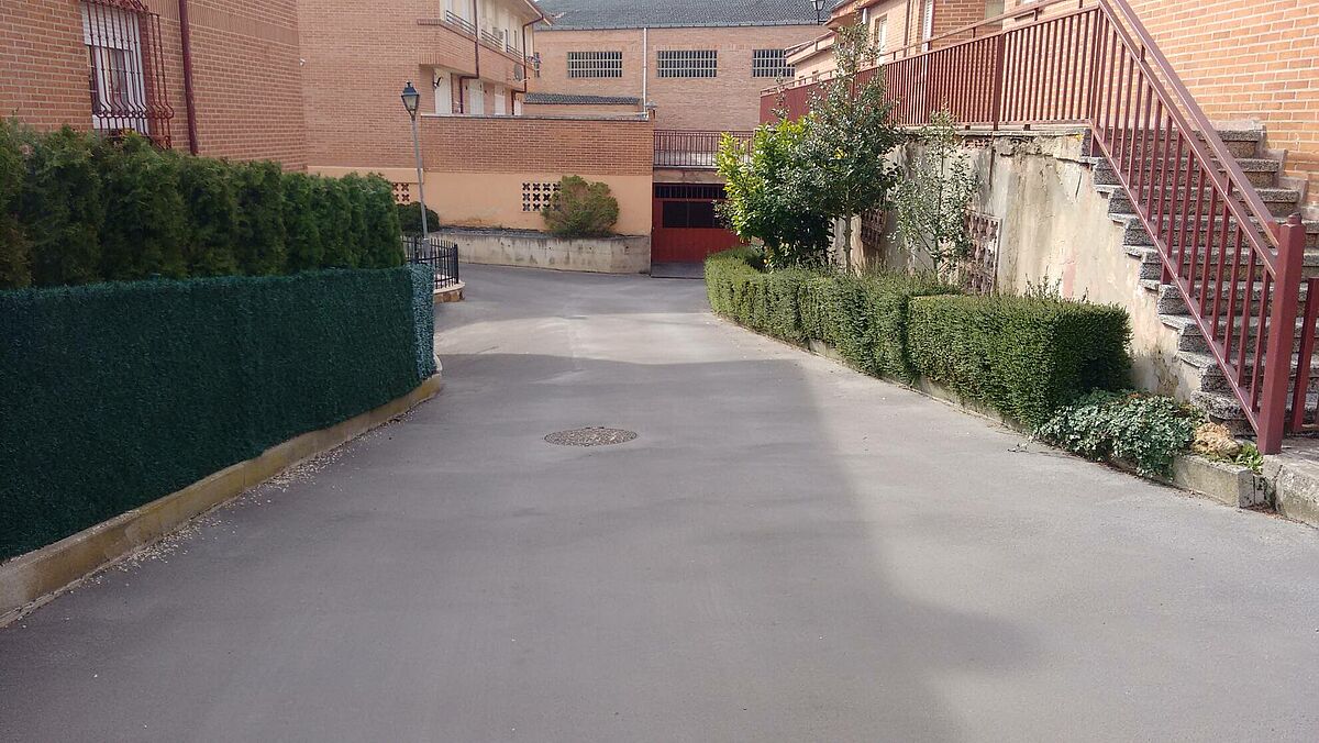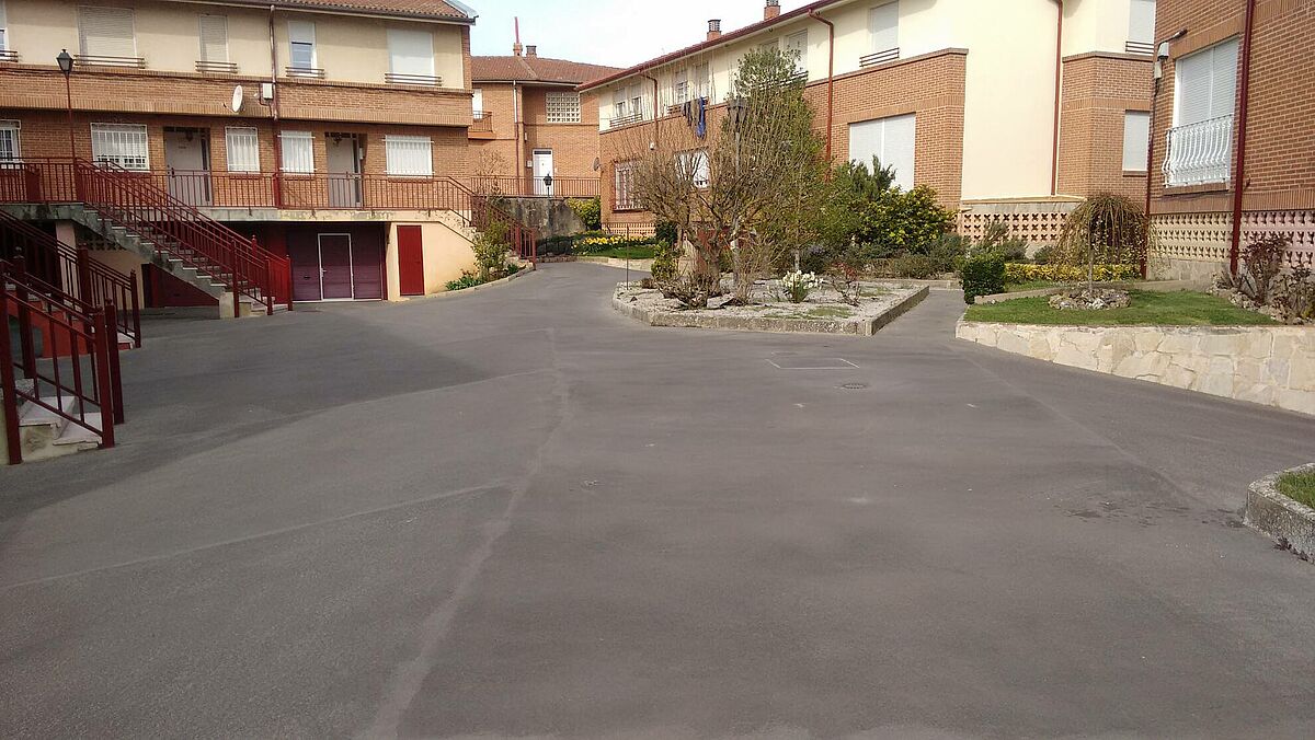 La solución efectuada por Clunia asfaltos fundidos, ha consistido en unas mínimas actuaciones de albañilería de saneamiento de las zonas más afectadas y realización de encuentros entre asfalto y otros pavimentos.