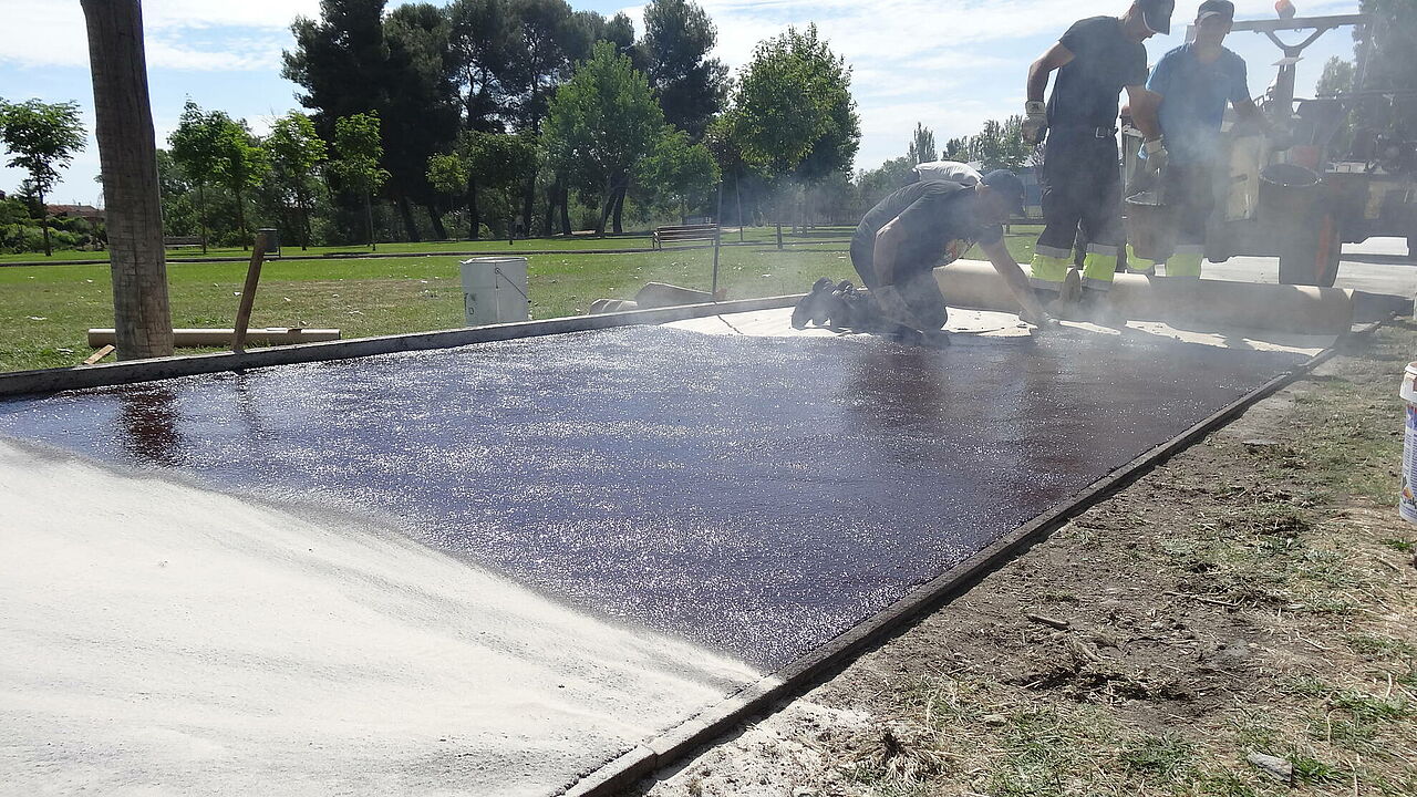 La actuación ha consistido en unas mínimas demoliciones de las zonas en peor estado y el posterior extendido de una capa de 2 cm de espesor de asfalto fundido coloreado en rojo y siliceado.