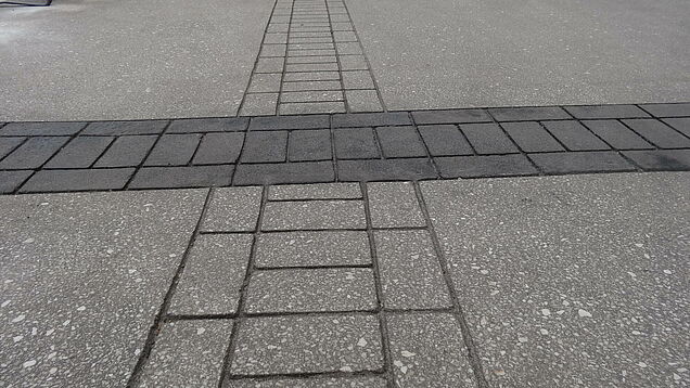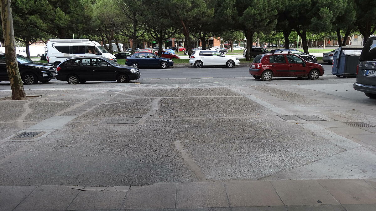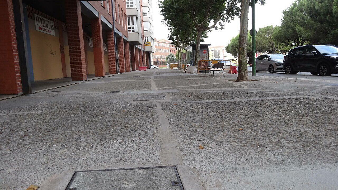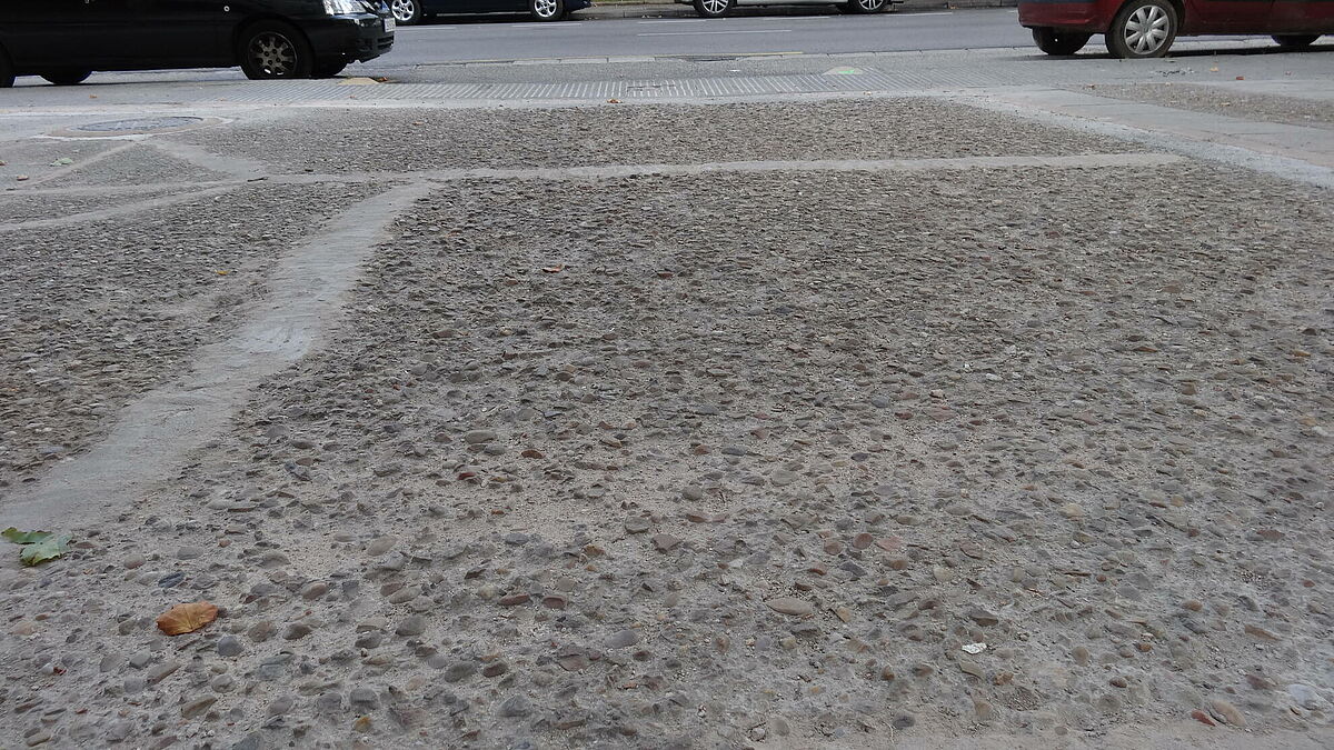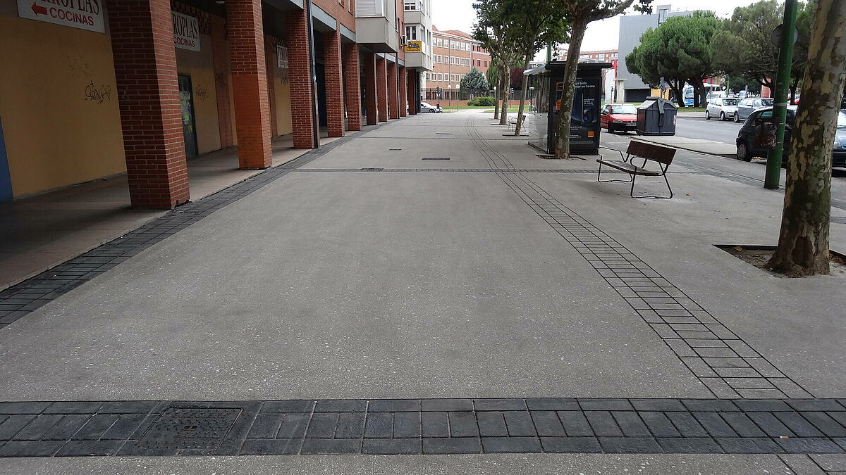 Se ha decidido para éste proyecto un acabado decorativo que consiste en la impresión de cenefas longitudinales y transversales, y la combinación del pulido o no de las mismas. Dotando a la acera de un acabado personalizado y elegante.