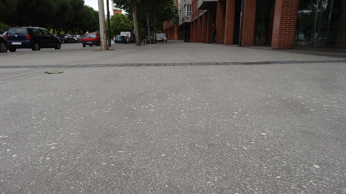 En éste caso se trata de aceras de hormigón en muy mal estado debido a la acción de la sal y las heladas. Aplicando una capa de 2,5 cm de espesor directamente sobre el hormigón, se consigue una renovación total de la acera en un tiempo record de 3 días.