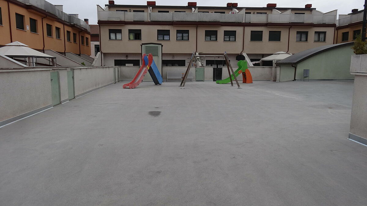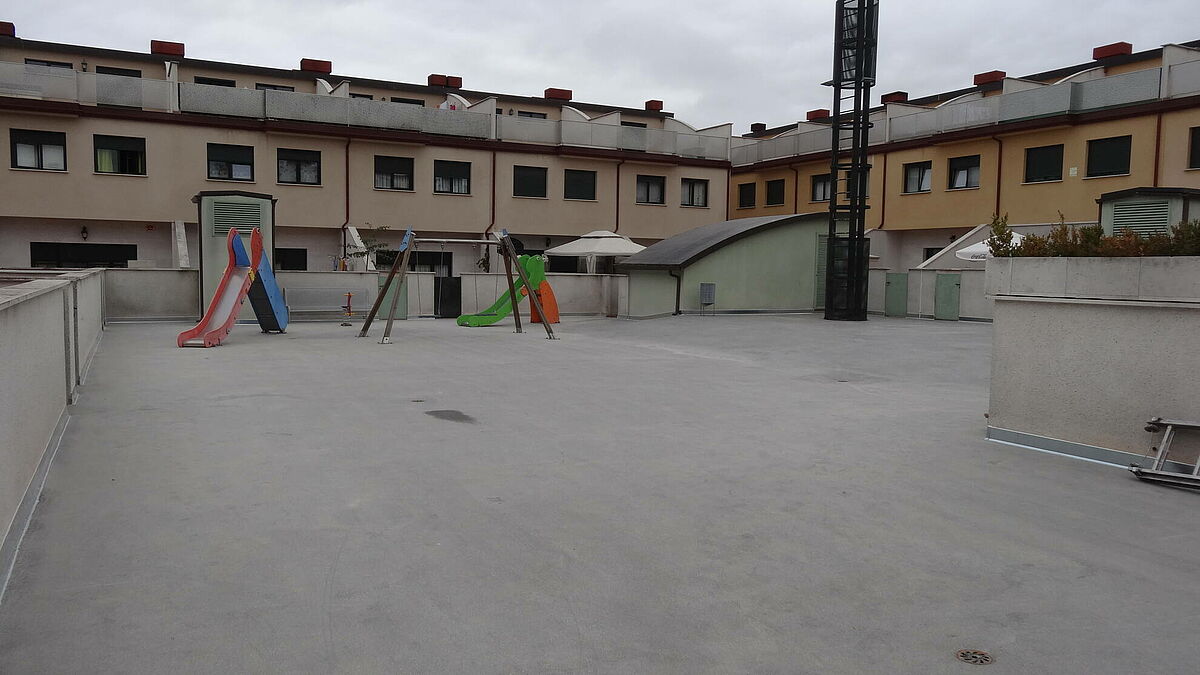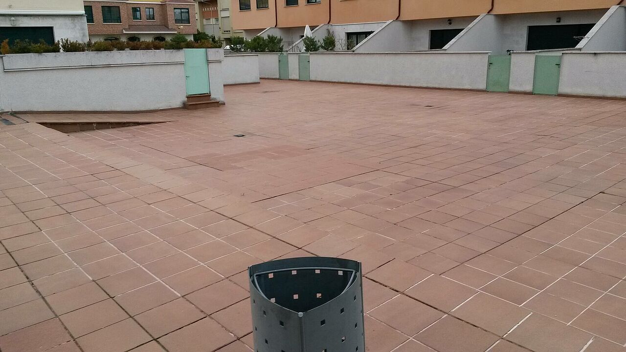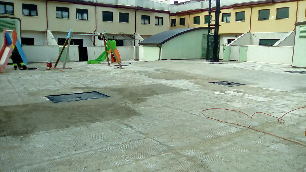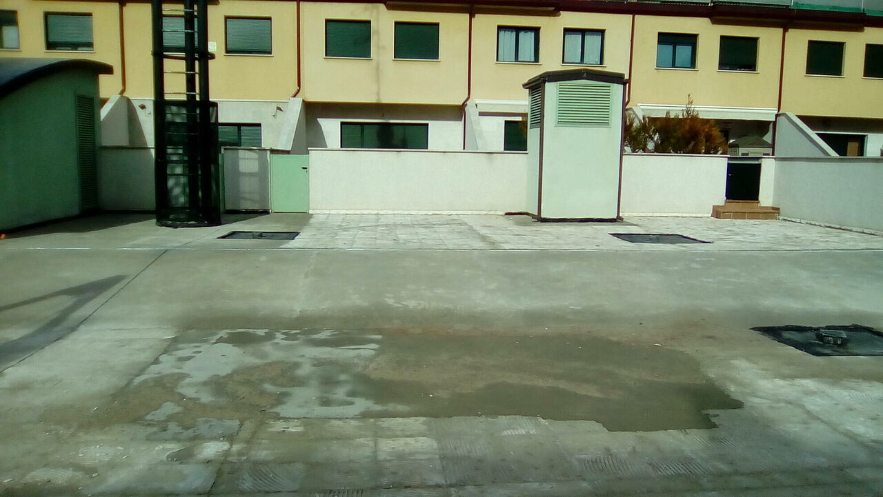 Clunia asfaltos fundidos ha terminado la pavimentación de un patio interior con abundantes goteras debido a una incorrecta ejecución en el momento de la ejecución del edificio.