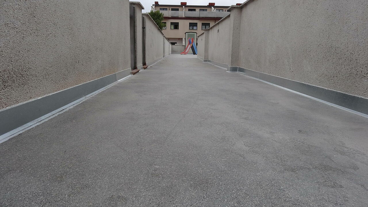 Debido a la enorme dificultad que conlleva la ubicación exacta de las mismas, ya que el patio está dividido en terrazas y la dificultad de acceso de cualquier tipo de maquinaria, la dirección del proyecto se ha decidido por una pavimentación con asfalto fundido.
