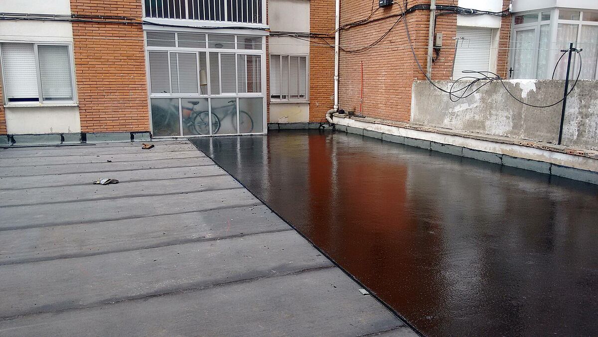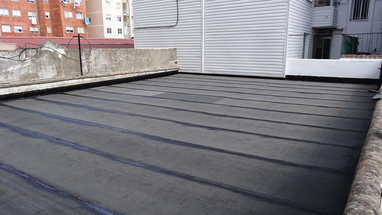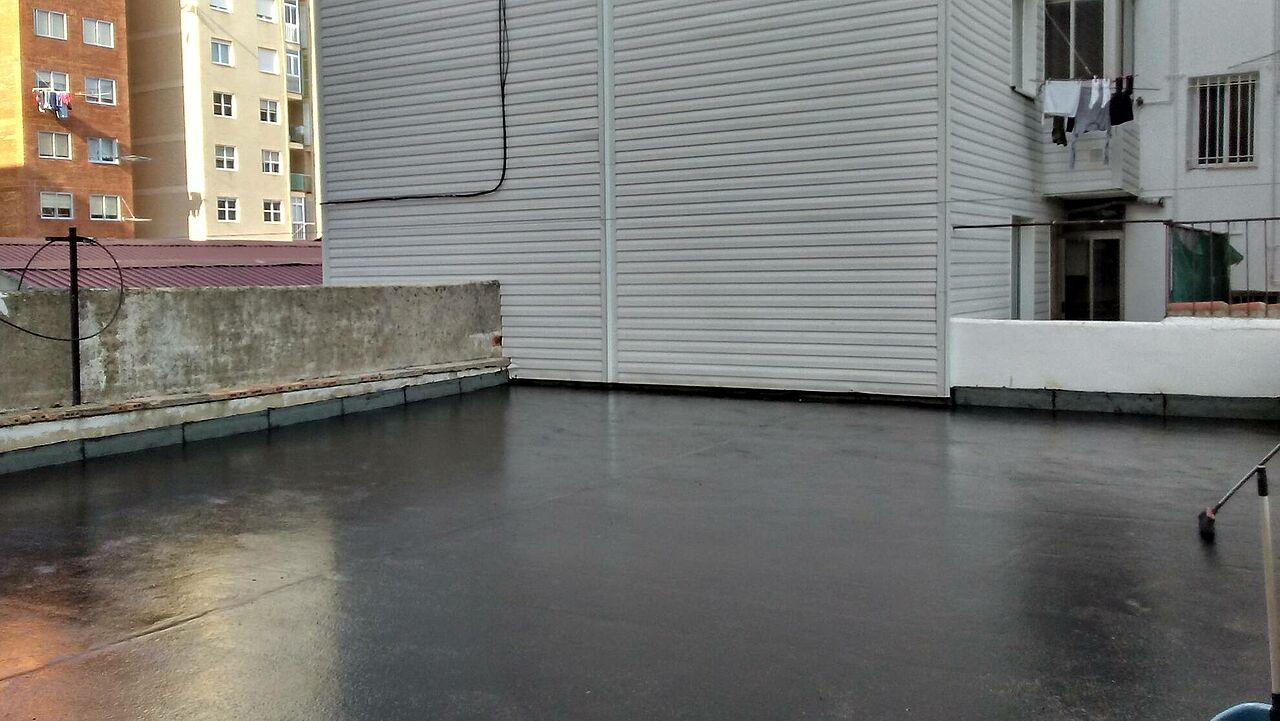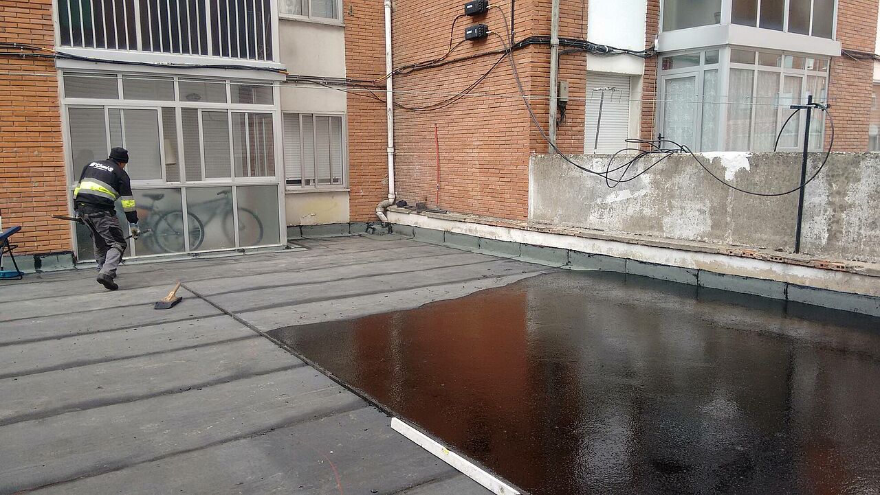 Realizando unas mínimas actuaciones sobre el soporte, colocamos nuestras telas sobre la misma baldosa, eliminando demoliciones que alargan y encarecen la obra. Posteriormente se aplica la capa de asfalto fundido, fundiendo éste, la tela colocada y dando lugar a una capa sin ningún tipo de juntas y absolutamente impermeable.
