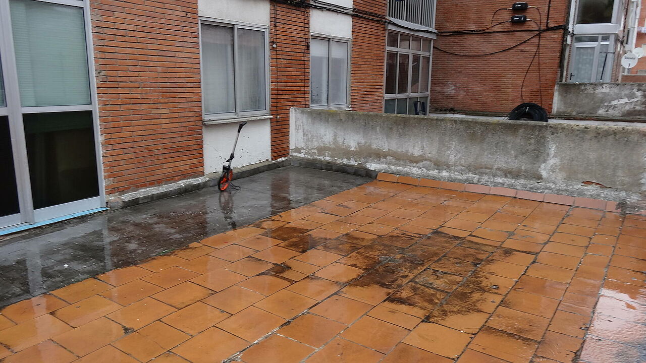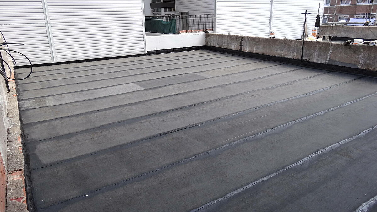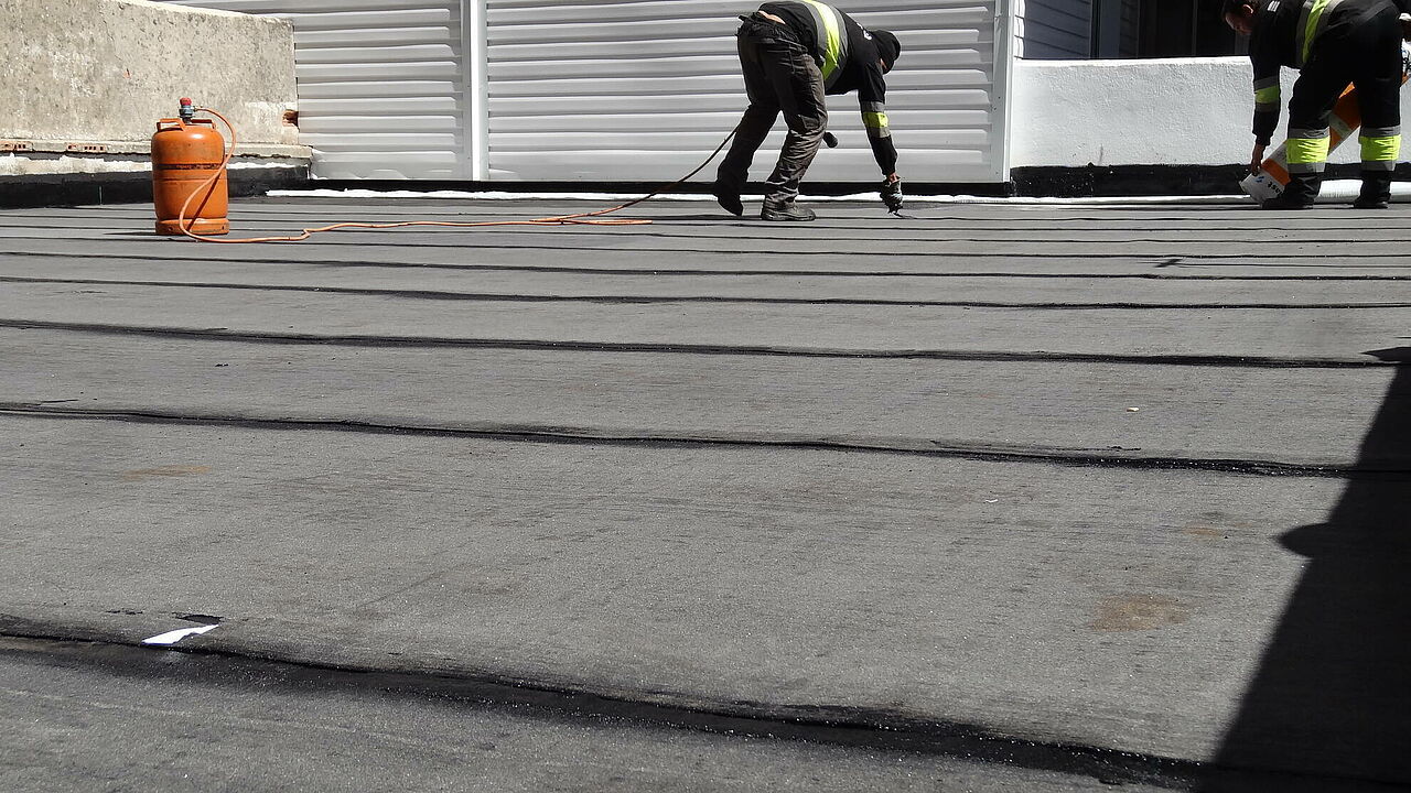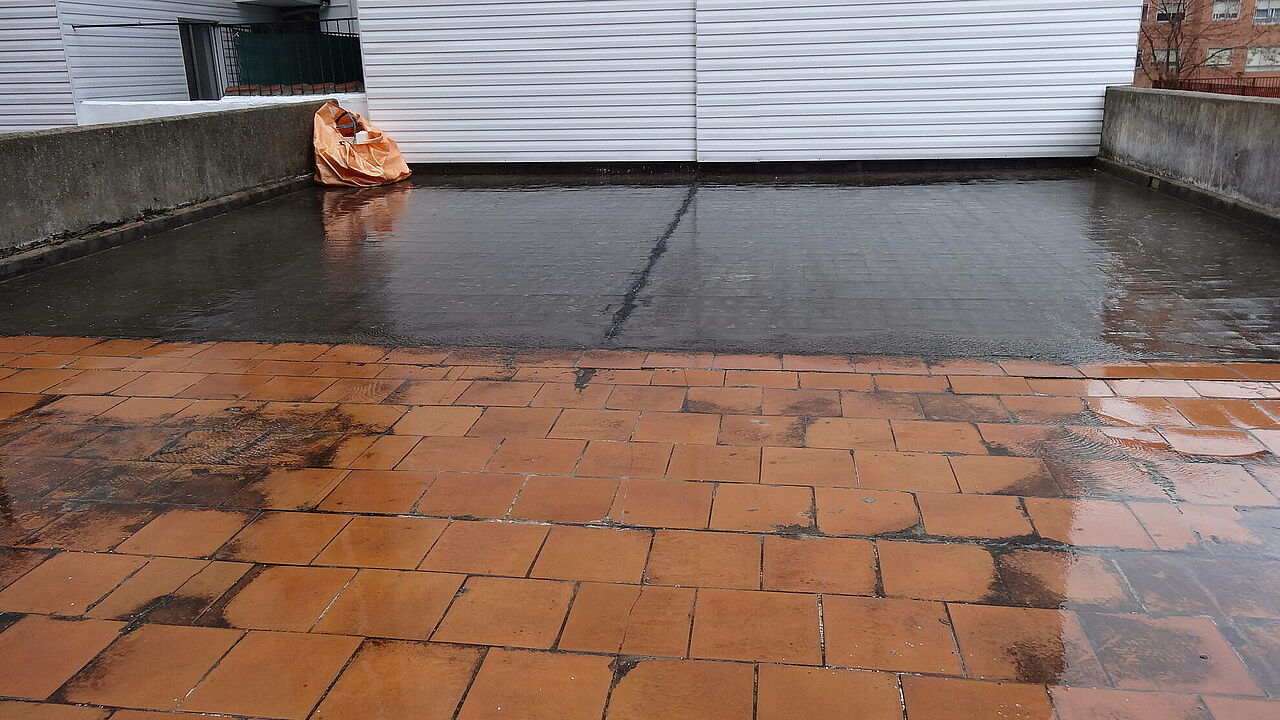 Realizando unas mínimas actuaciones sobre el soporte, colocamos nuestras telas sobre la misma baldosa, eliminando demoliciones que alargan y encarecen la obra. Posteriormente se aplica la capa de asfalto fundido, fundiendo éste, la tela colocada y dando lugar a una capa sin ningún tipo de juntas y absolutamente impermeable.