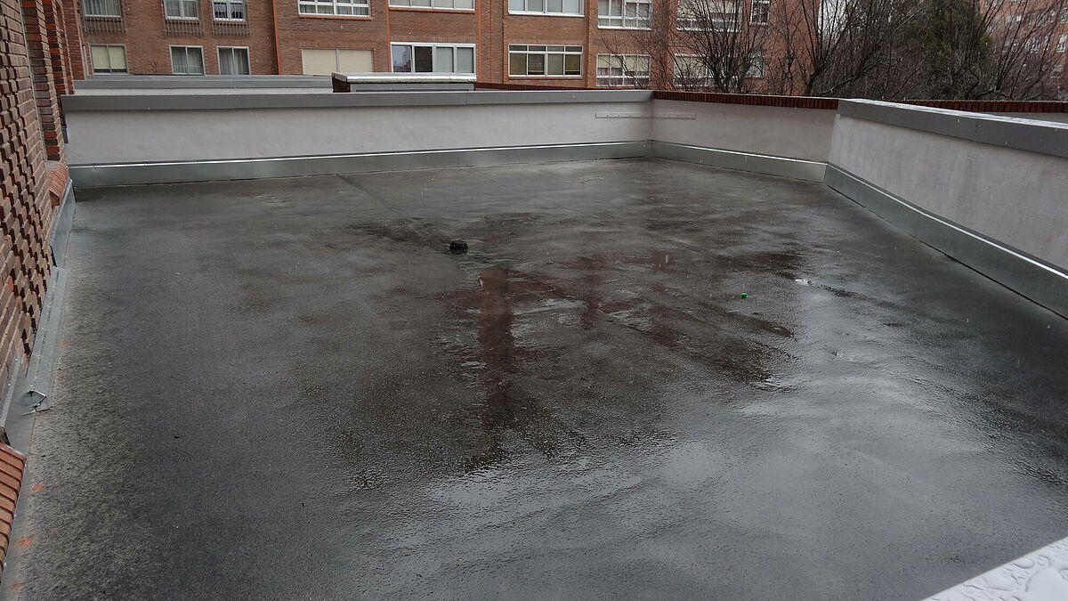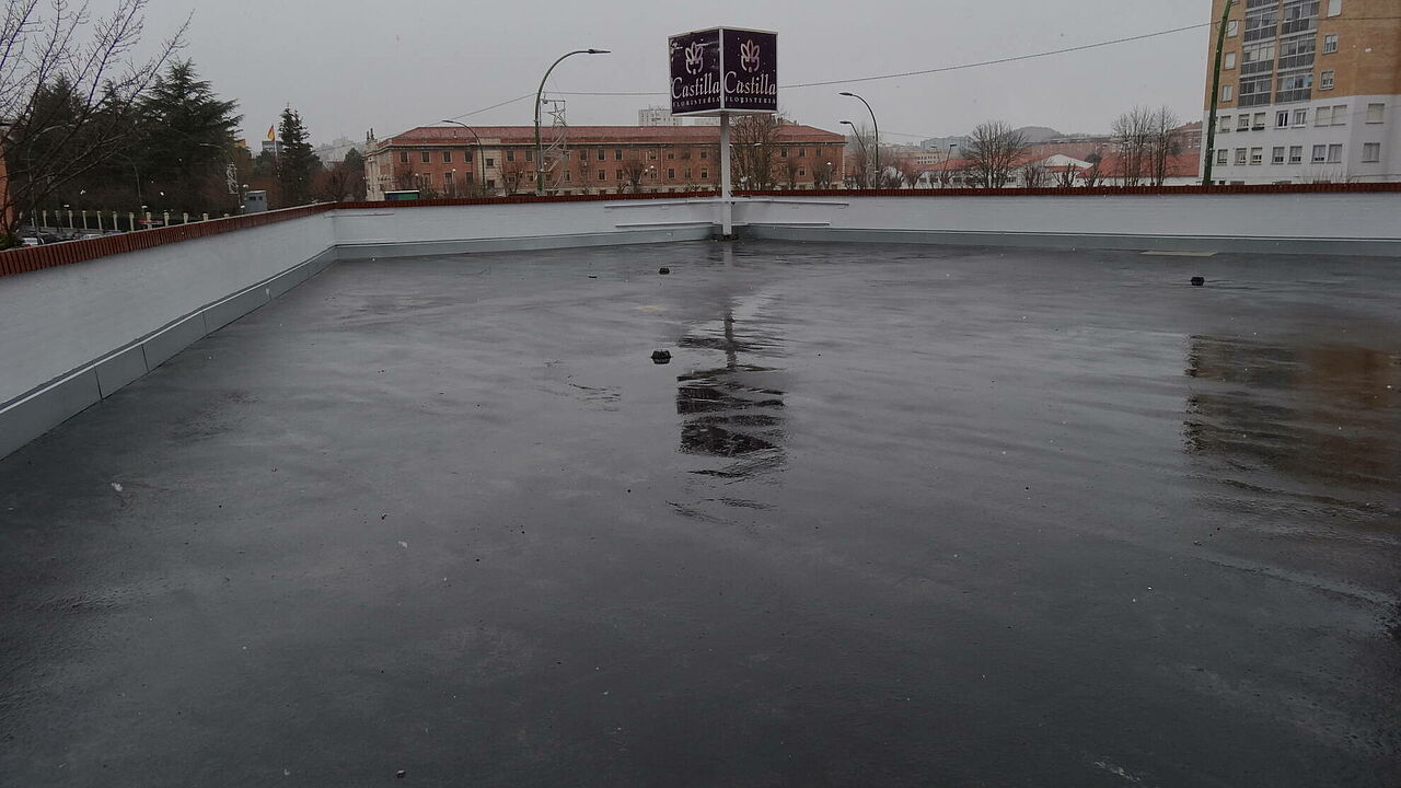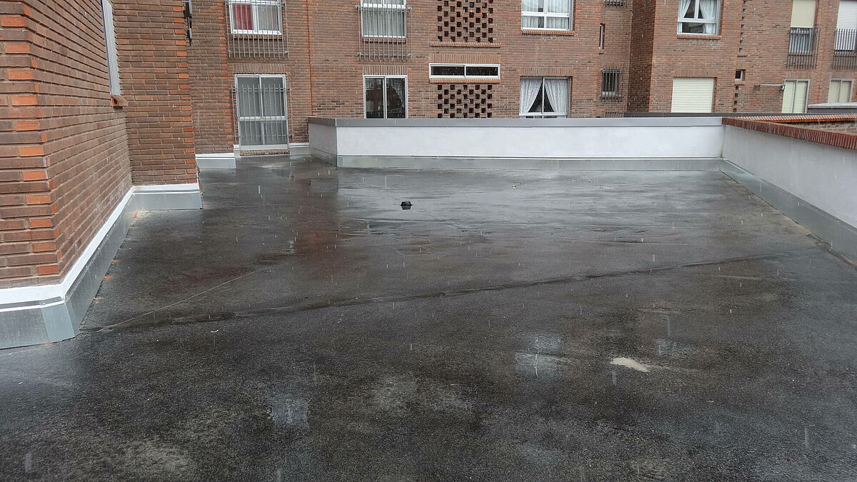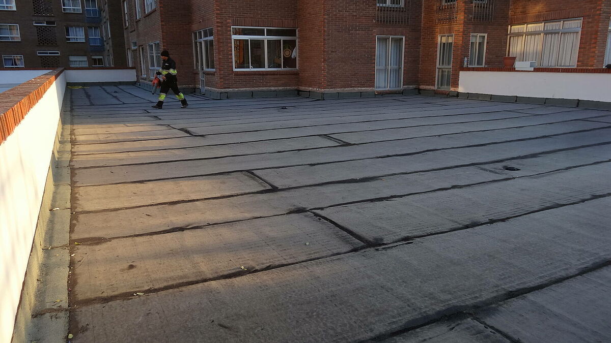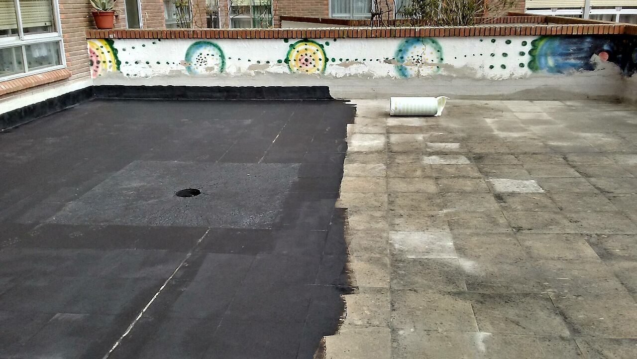 Tras la limpieza de la baldosa existente y demolición de los rodapies, se procede a la impermeabilización y pavimentación con asfalto fundido.