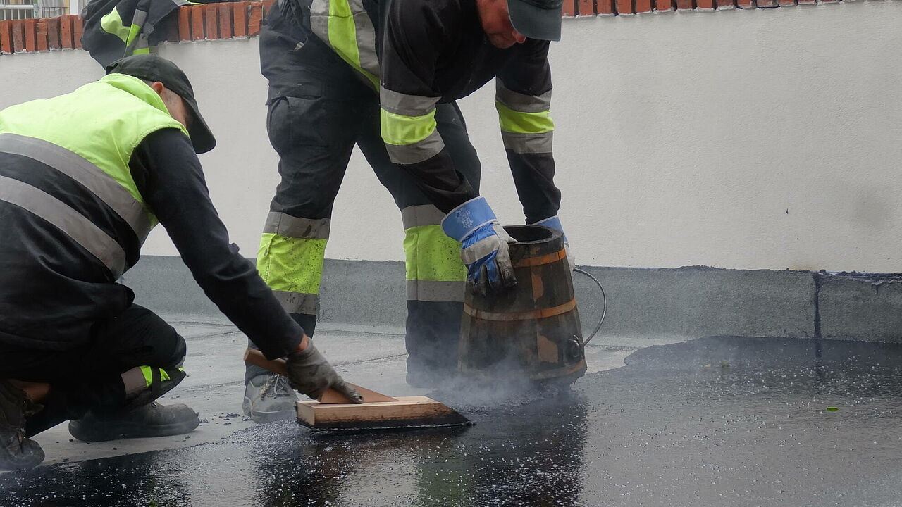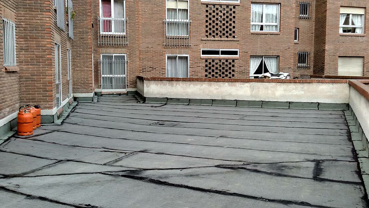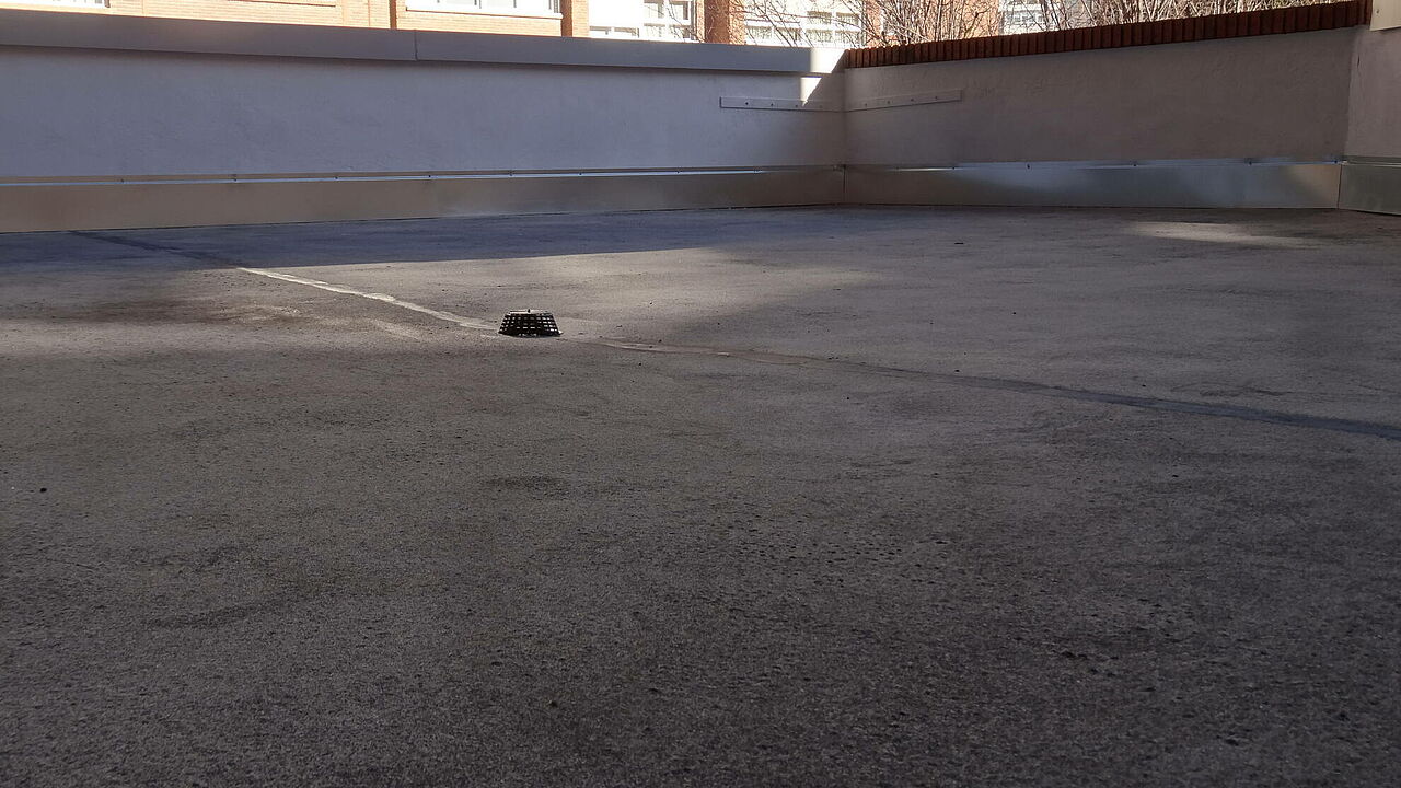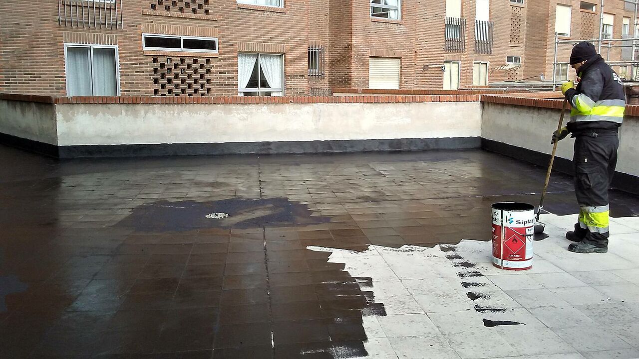 Tras la limpieza de la baldosa existente y demolición de los rodapies, se procede a la impermeabilización y pavimentación con asfalto fundido.