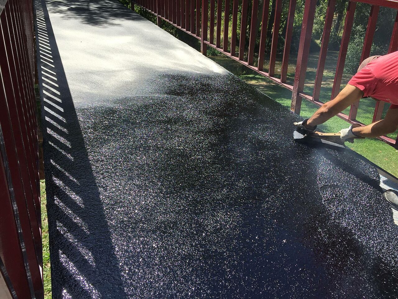 Su propiedad antideslizante, convierte al asfalto fundido en el producto ideal para este tipo de pasarelas y debido a su rapidez de aplicación y la escasa preparación del soporte, la molestia al peatón es mínima pues el acceso es inmediato.