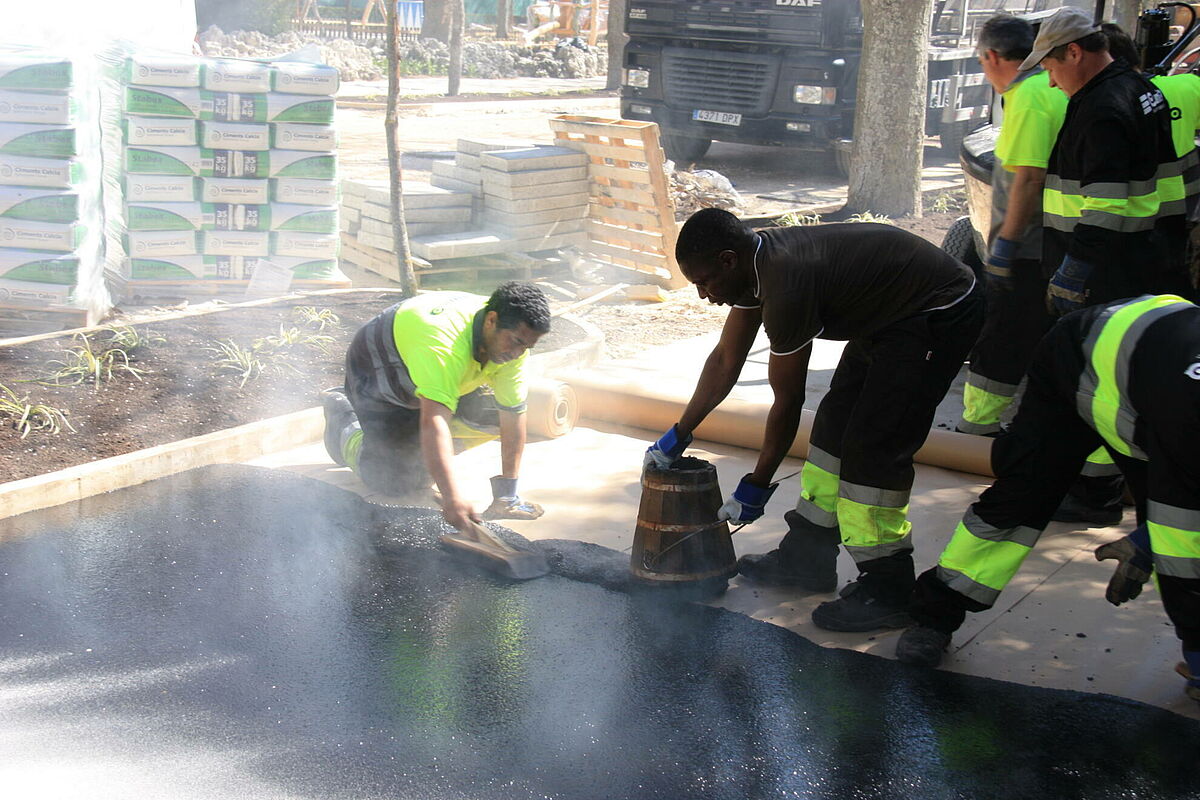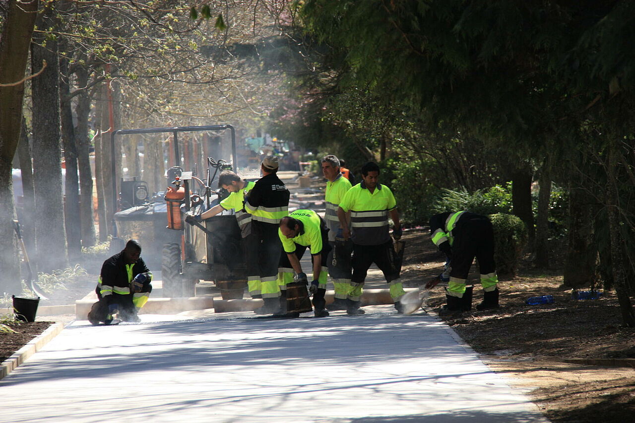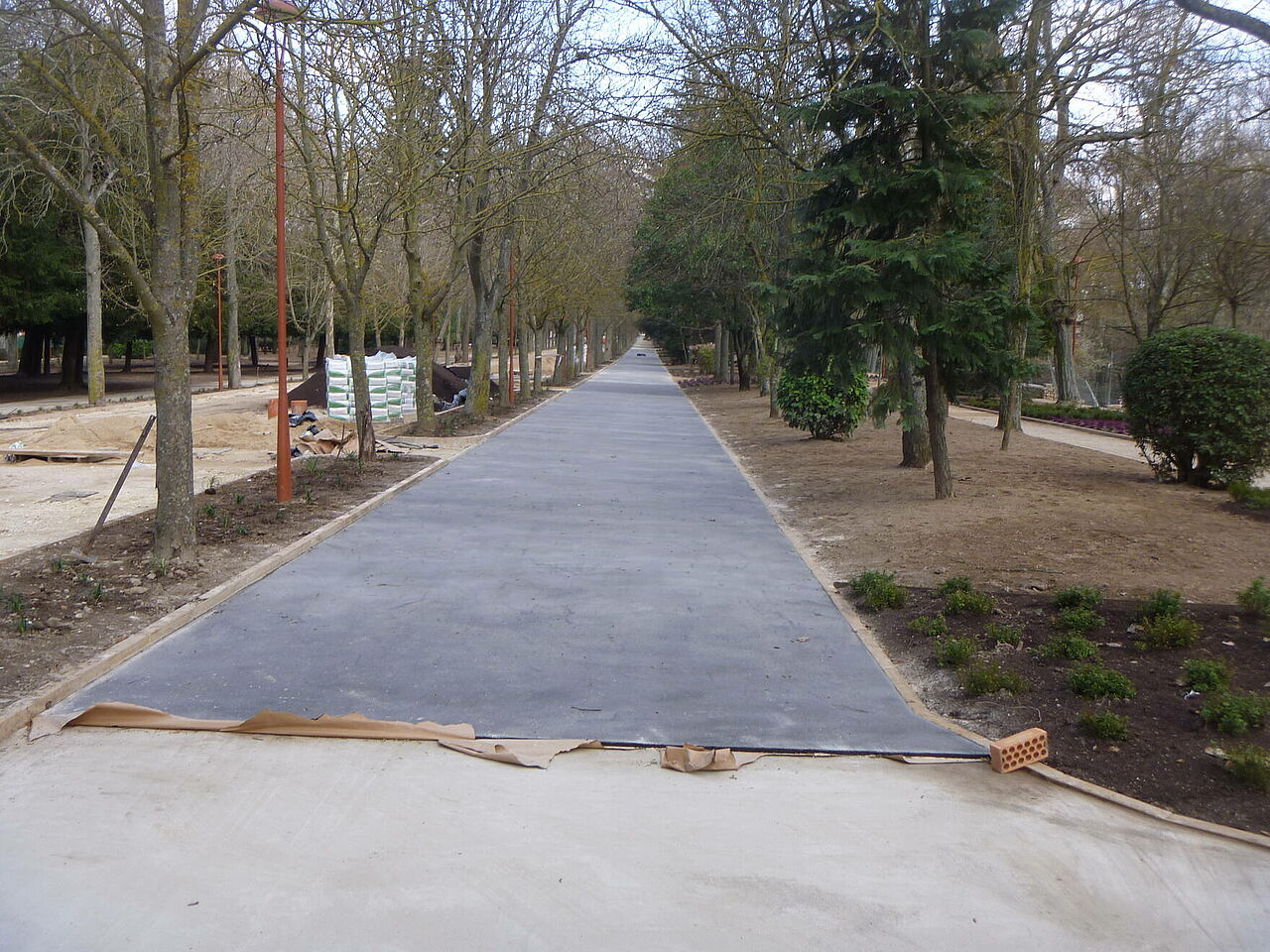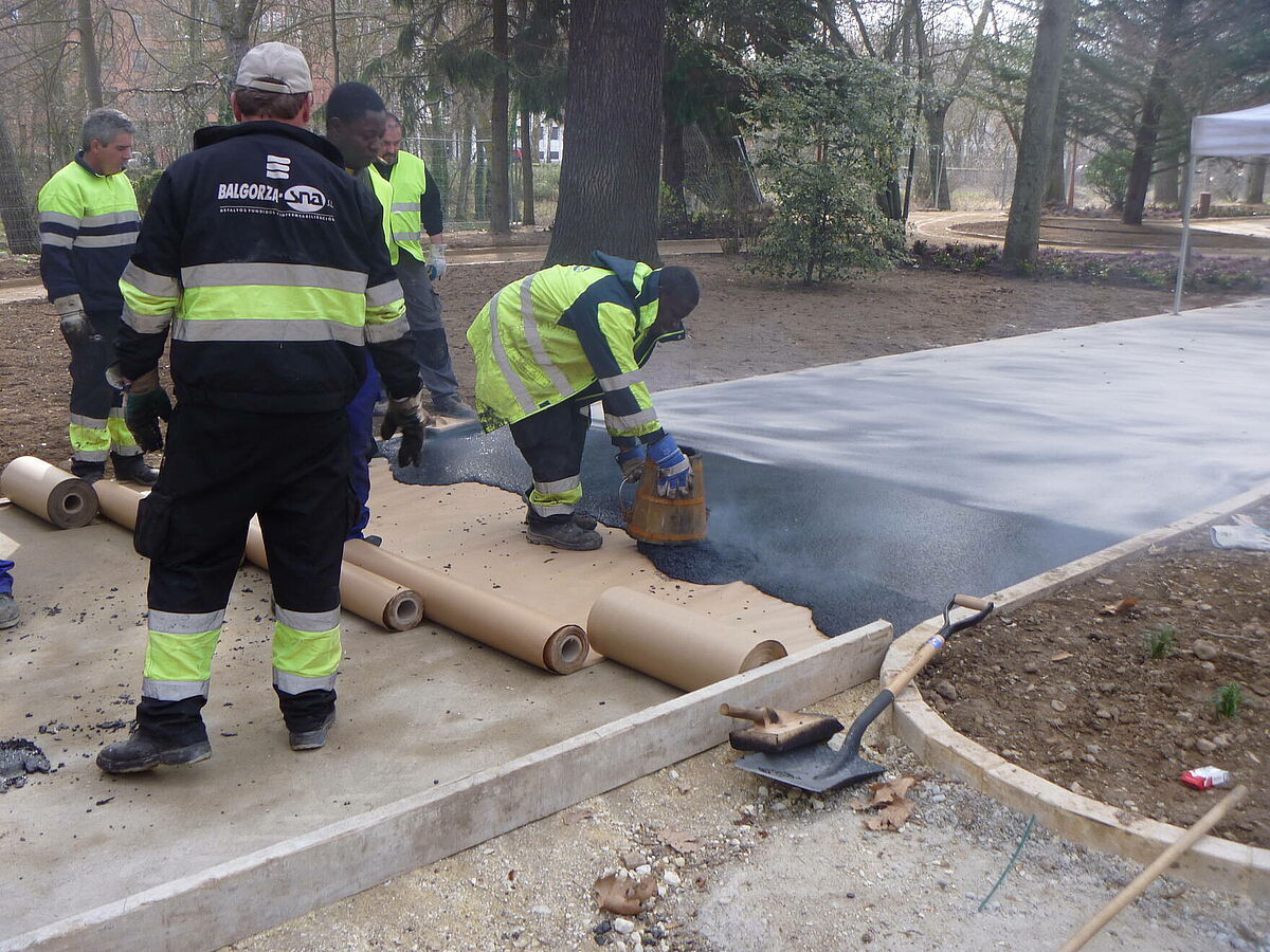 Se han ejecutado con asfalto fundido siliceado los paseos laterales que recorren todo el parque. Al ser un pavimento continuo, aporta grandes ventajas para éste tipo de paseos: