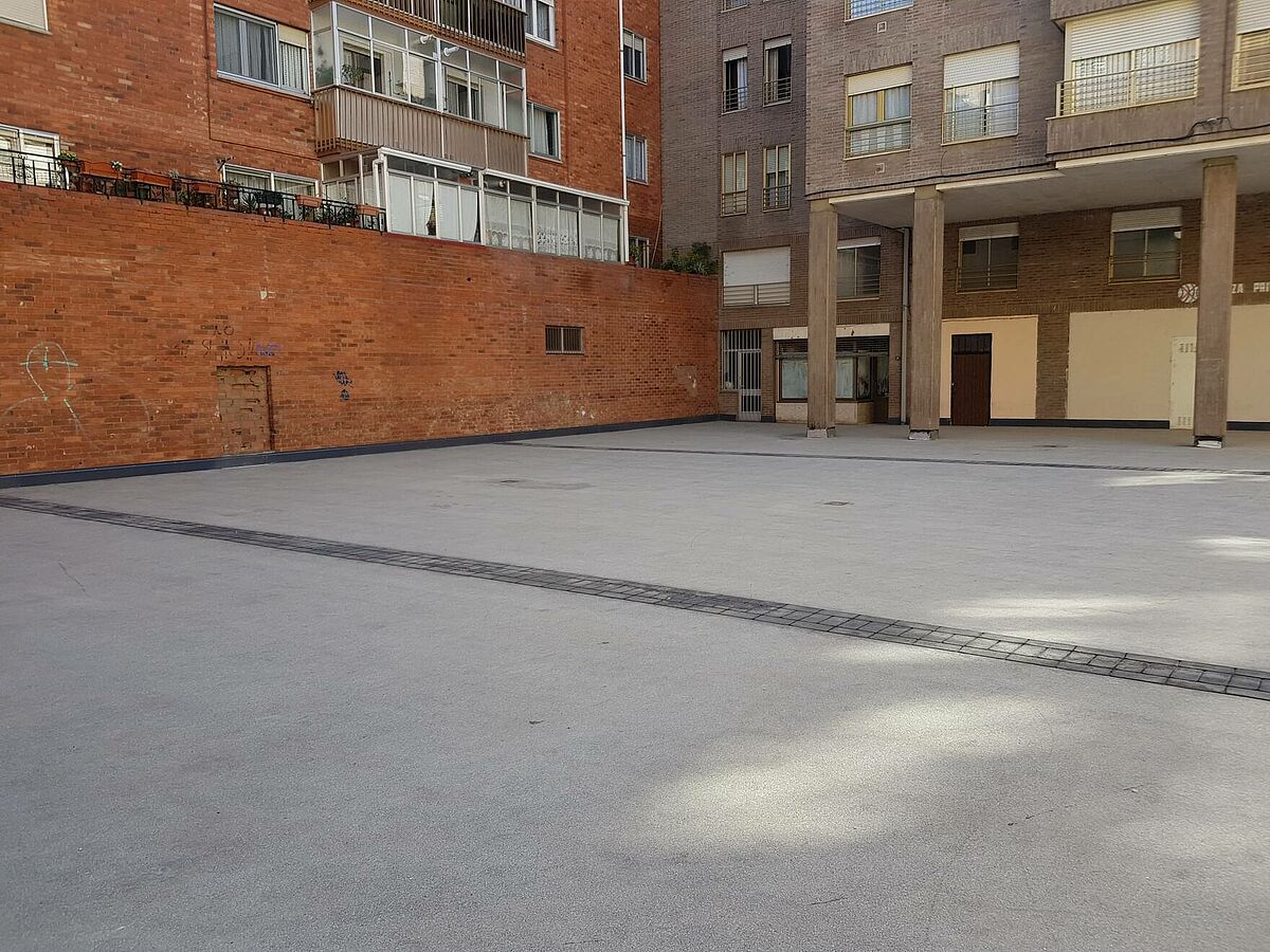 Como elemento decorativo se ha propuesto la ejecución de cenefas impresas sobre el asfalto y la ejecución del canto del forjado con asfalto fundido pulido.