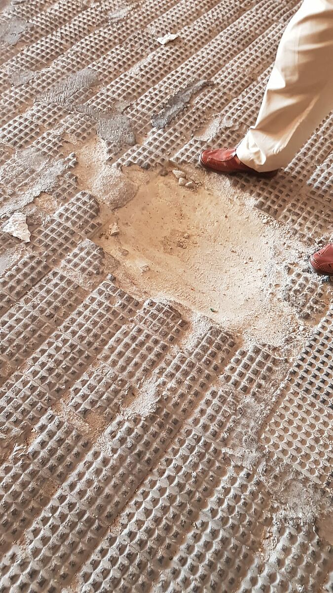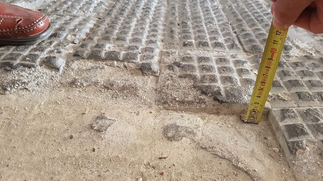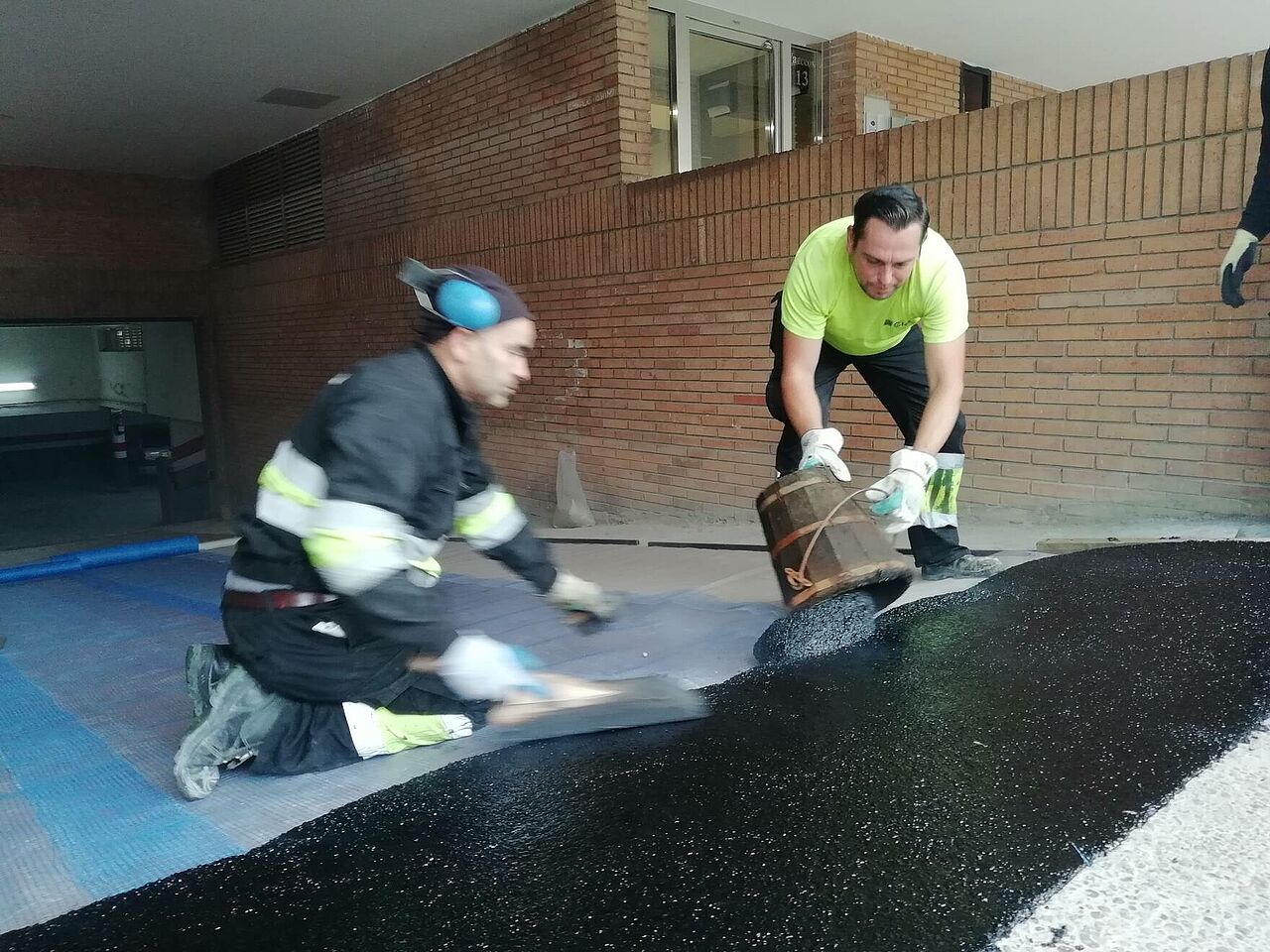 En sólo dos días se ha ejecutado la demolición completa tanto de la baldosa como del mortero hasta llegar a la capa de compresión que permite un correcto extendido del asfalto, al día siguiente se procede al extendido del fundido y posterior impreso tipo adoquín recto.