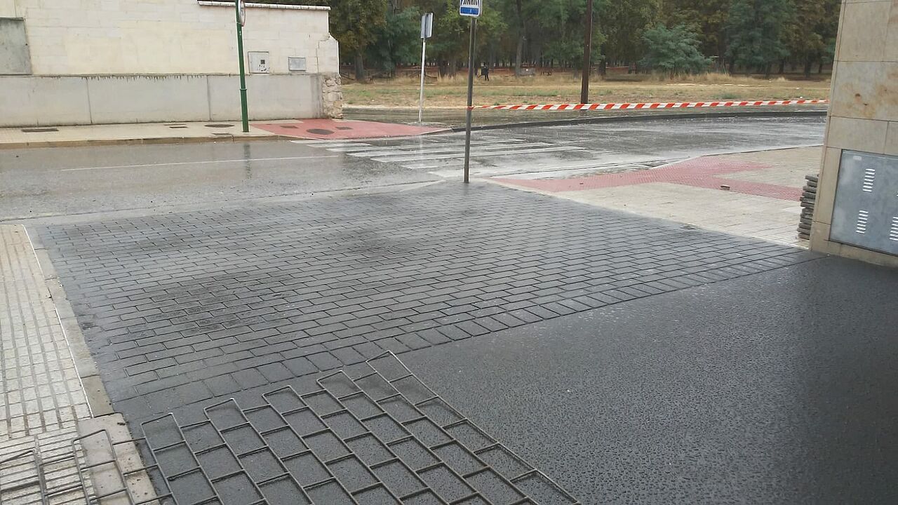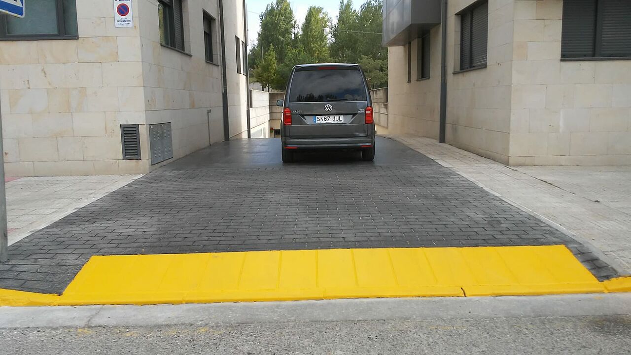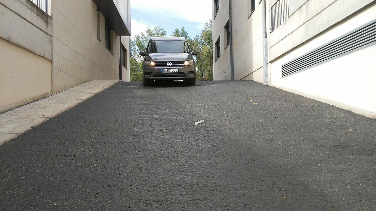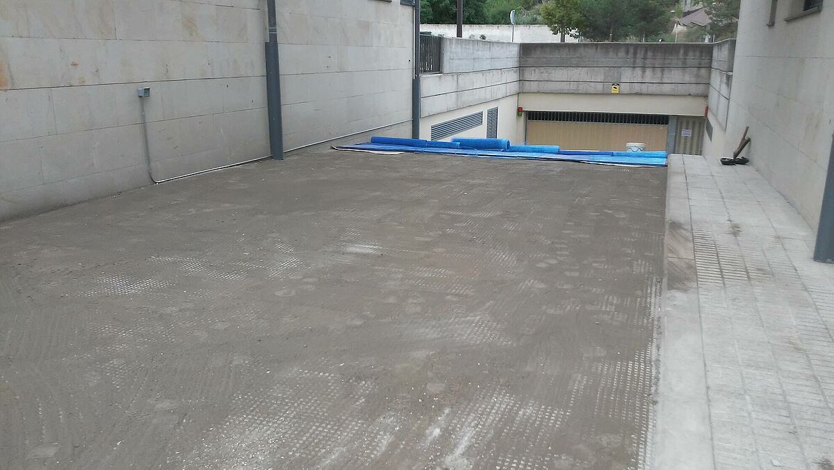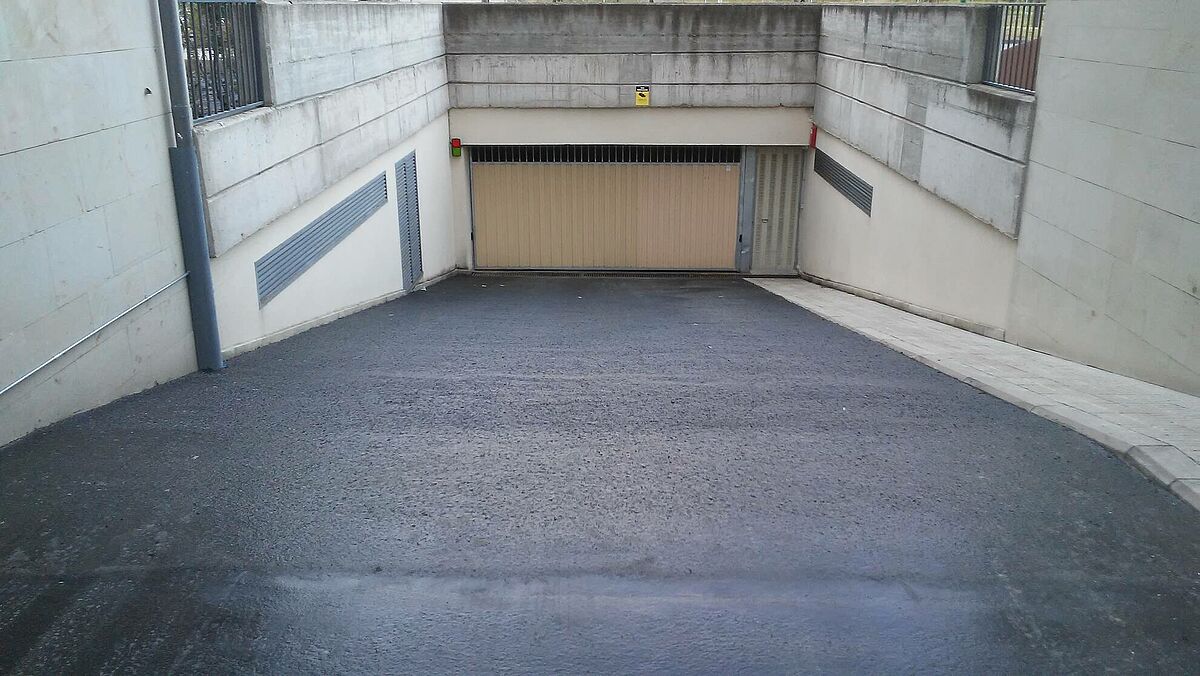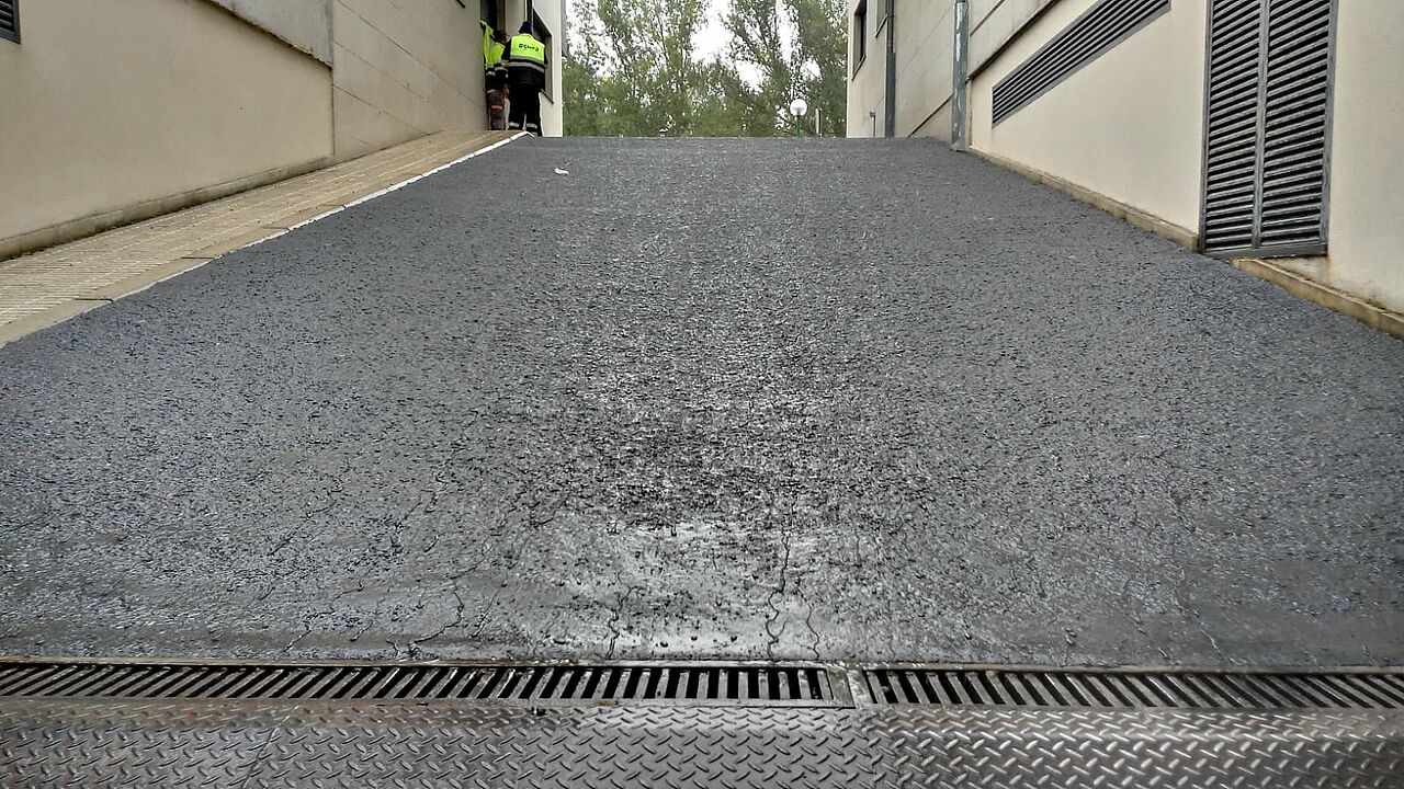 En éste caso se trata de una rampa de acceso a garajes. Realizando unas mínimas preparaciones del soporte, se procede a la aplicación de una capa de 2,5 cm de asfalto fundido sobre la baldosa existente y una hora después de la finalización de los trabajos se puede acceder con vehículos.