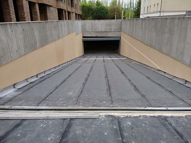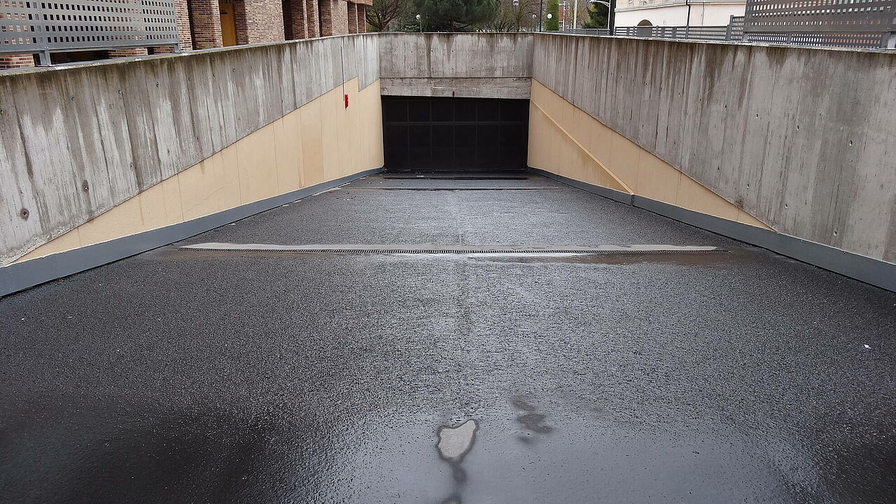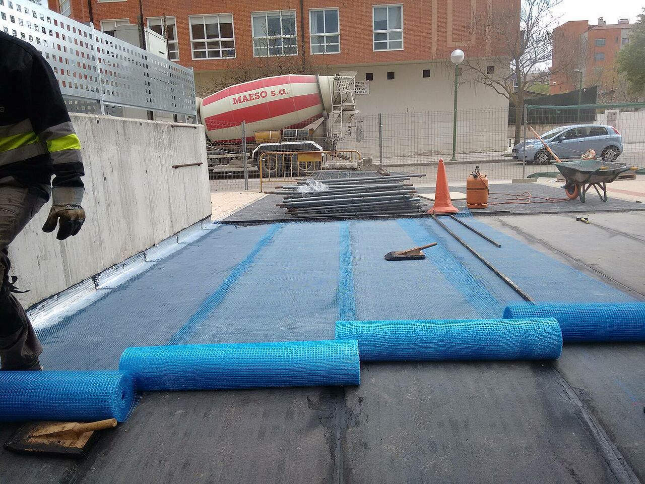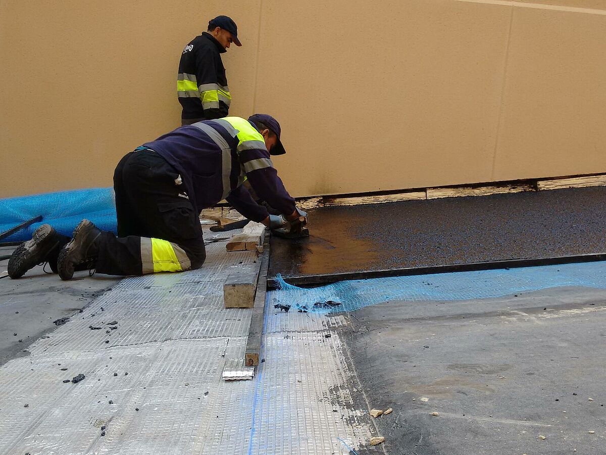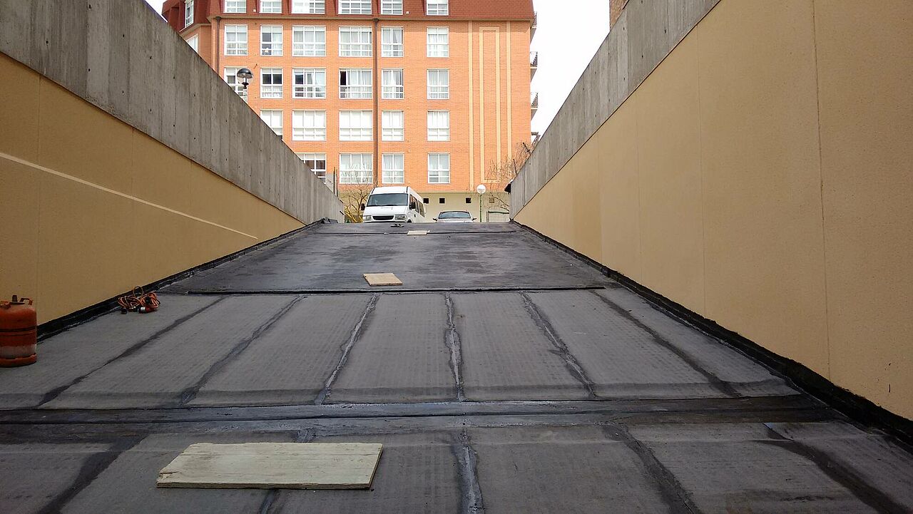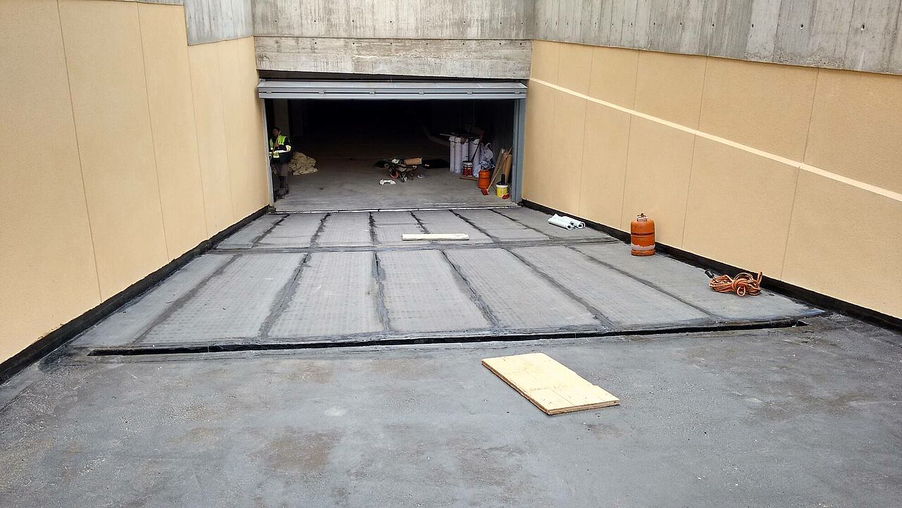 El equipo de Clunia asfaltos fundidos, está realizando los trabajos de impermeabilización con el sistema bicapa mixto, para una rampa de garaje en el barrio de Fuentecillas.