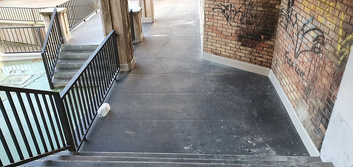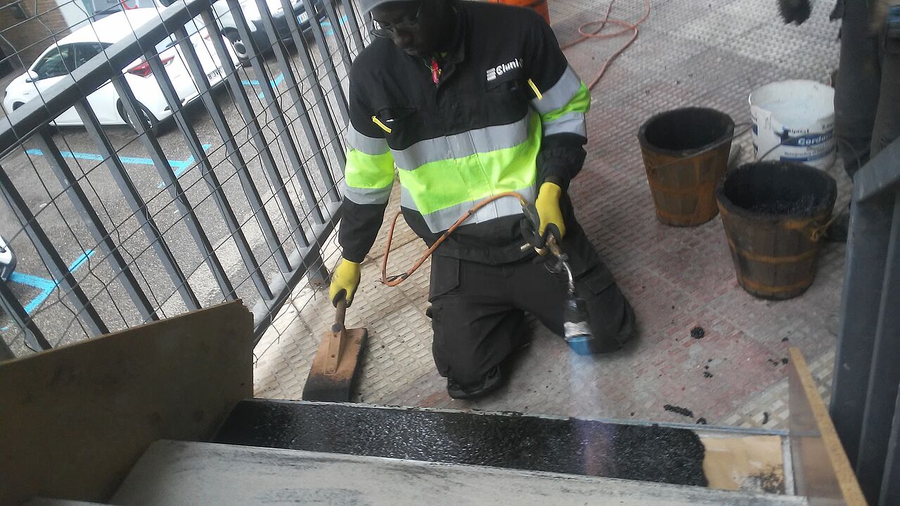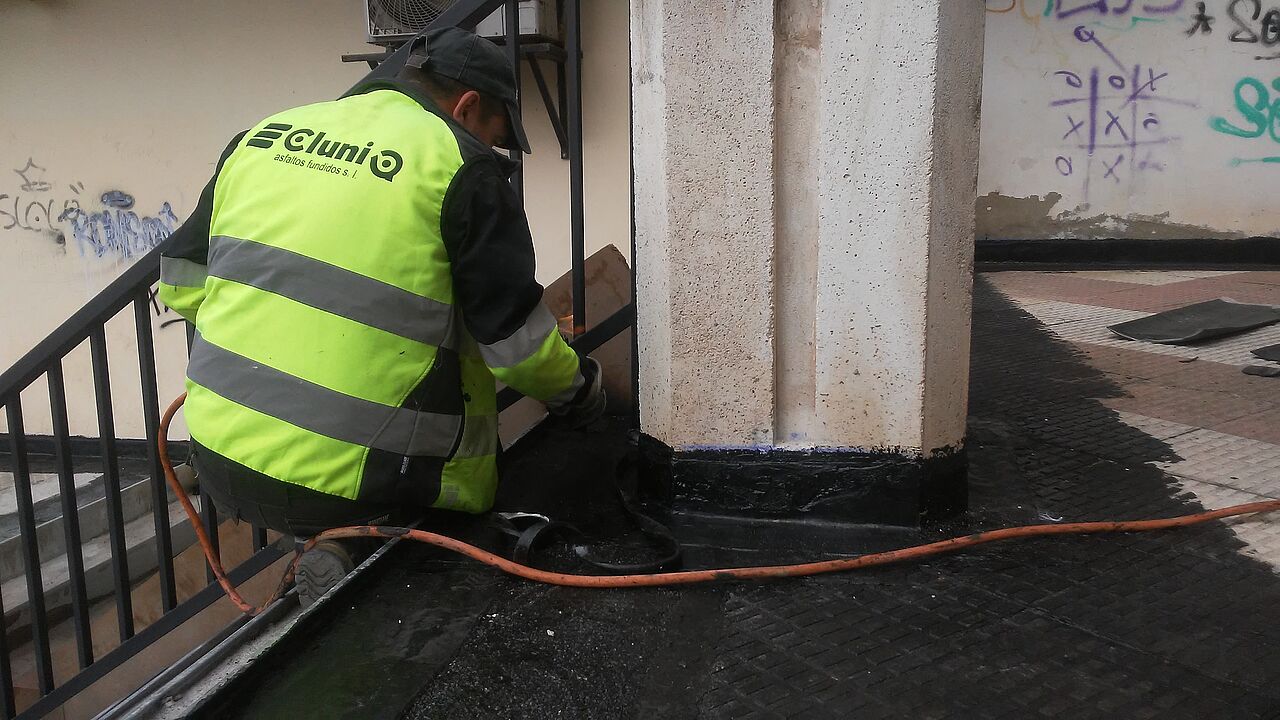La aplicación del asfalto fundido no sólo realiza la función impermeabilizante sino que a su vez sirve de capa protectora frente al daño estético, peligro de desprendimiento de los revestimientos laterales y de la aparición de eflorescencias en tramos de escaleras.