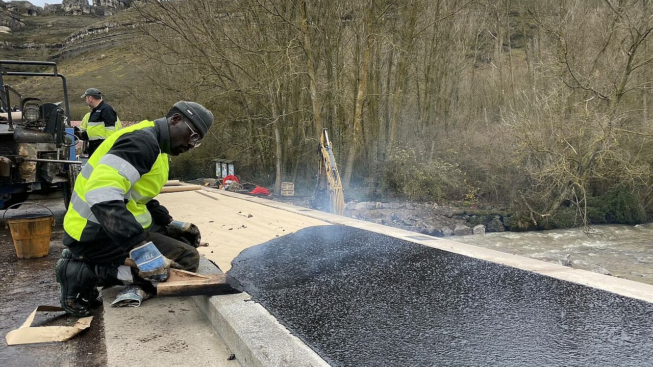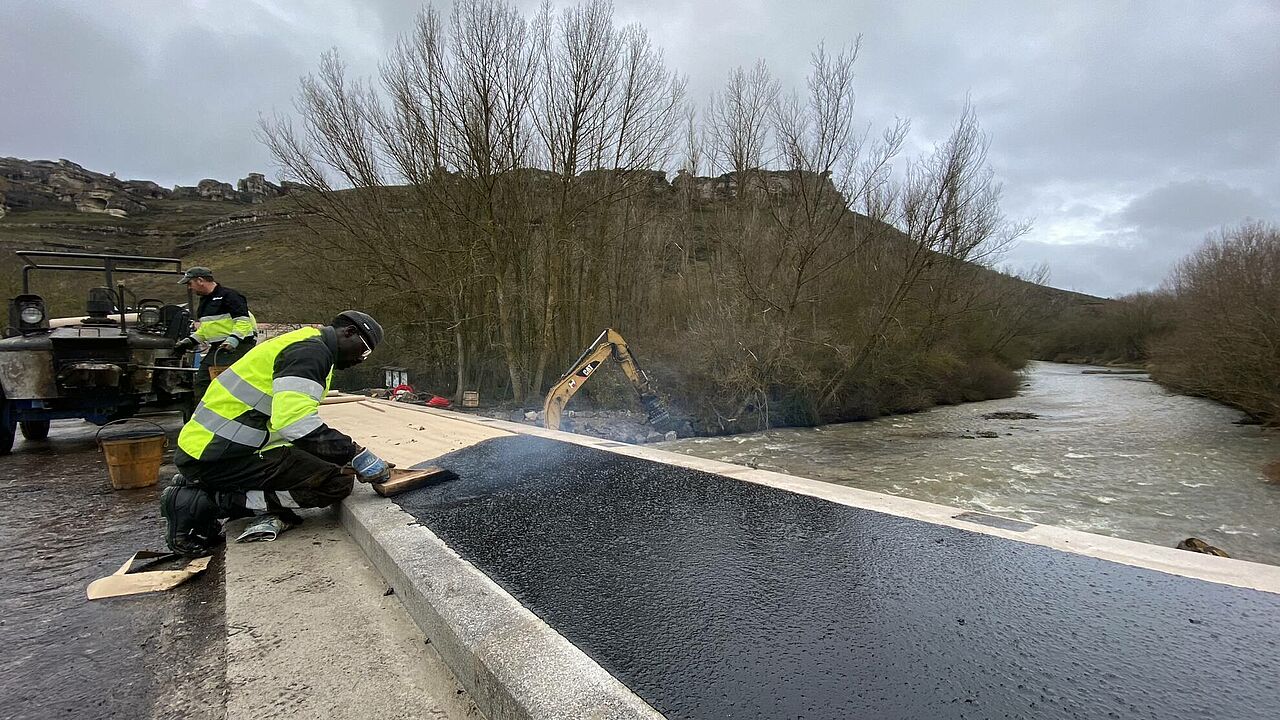 Descripción del proyecto: Nos desplazamos al municipio de Villaescusa de las Torres, rincón de la montaña palentina y único acceso al monumento natural de las Tuerces a realizar la pavimentación de un nuevo puente sobre el río Pisuerga.