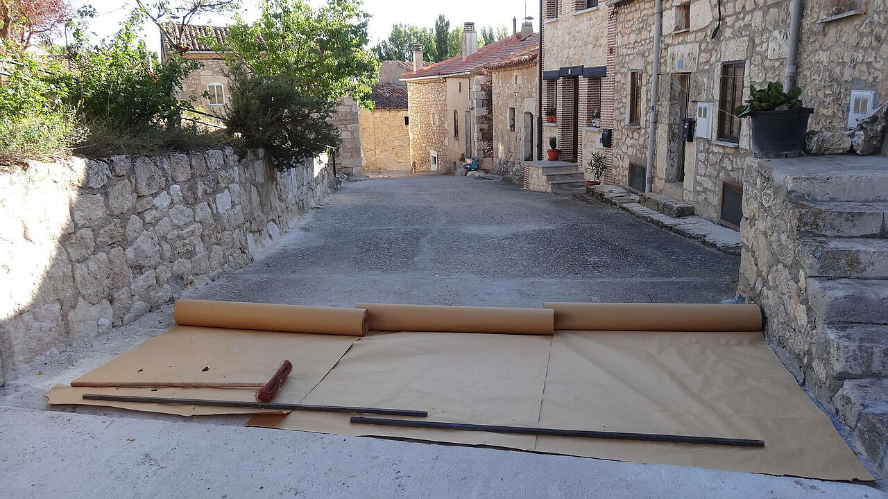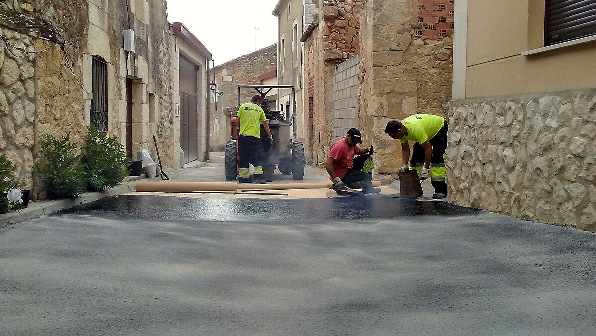 Albañiles del pueblo, bajo el asesoramiento del equipo de Clunia asfaltos fundidos, ejecutan unos sencillos trabajos de preparación de superficie, encuentros con pavimentos adyacentes, elevación de tapas y mínima regularización de superficie en las zonas mas irregulares.