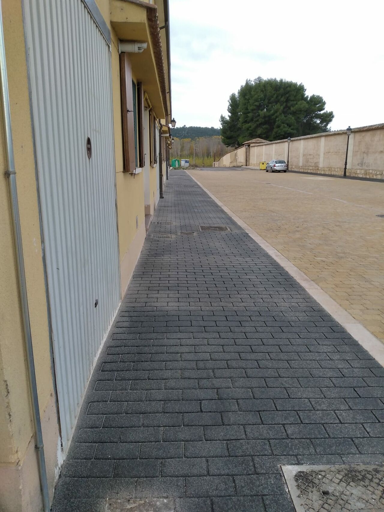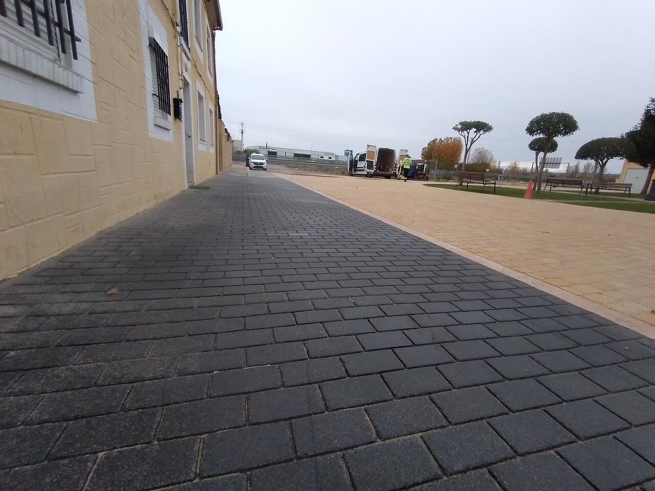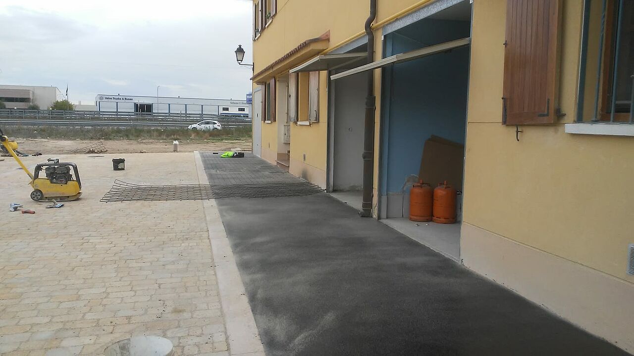 Se ha buscado un pavimento impreso que soporte el tráfico de los vehiculos y la climatología del entorno y que destaque con el adoquín beige colocado en el resto de la plaza.
