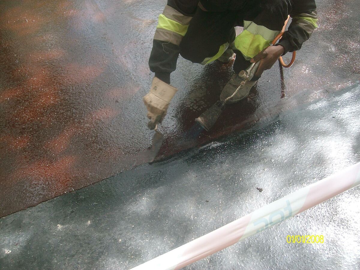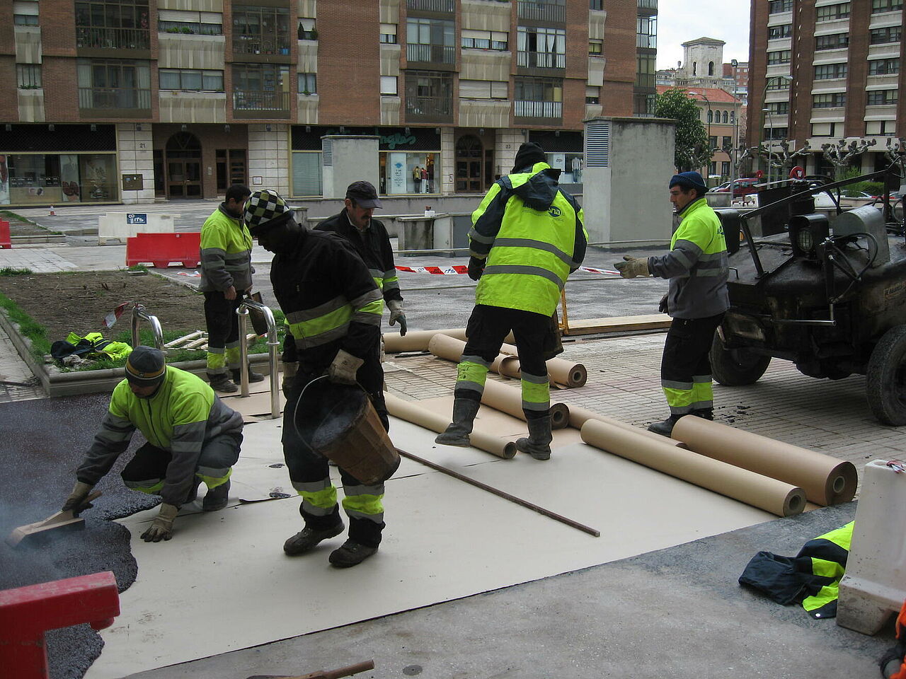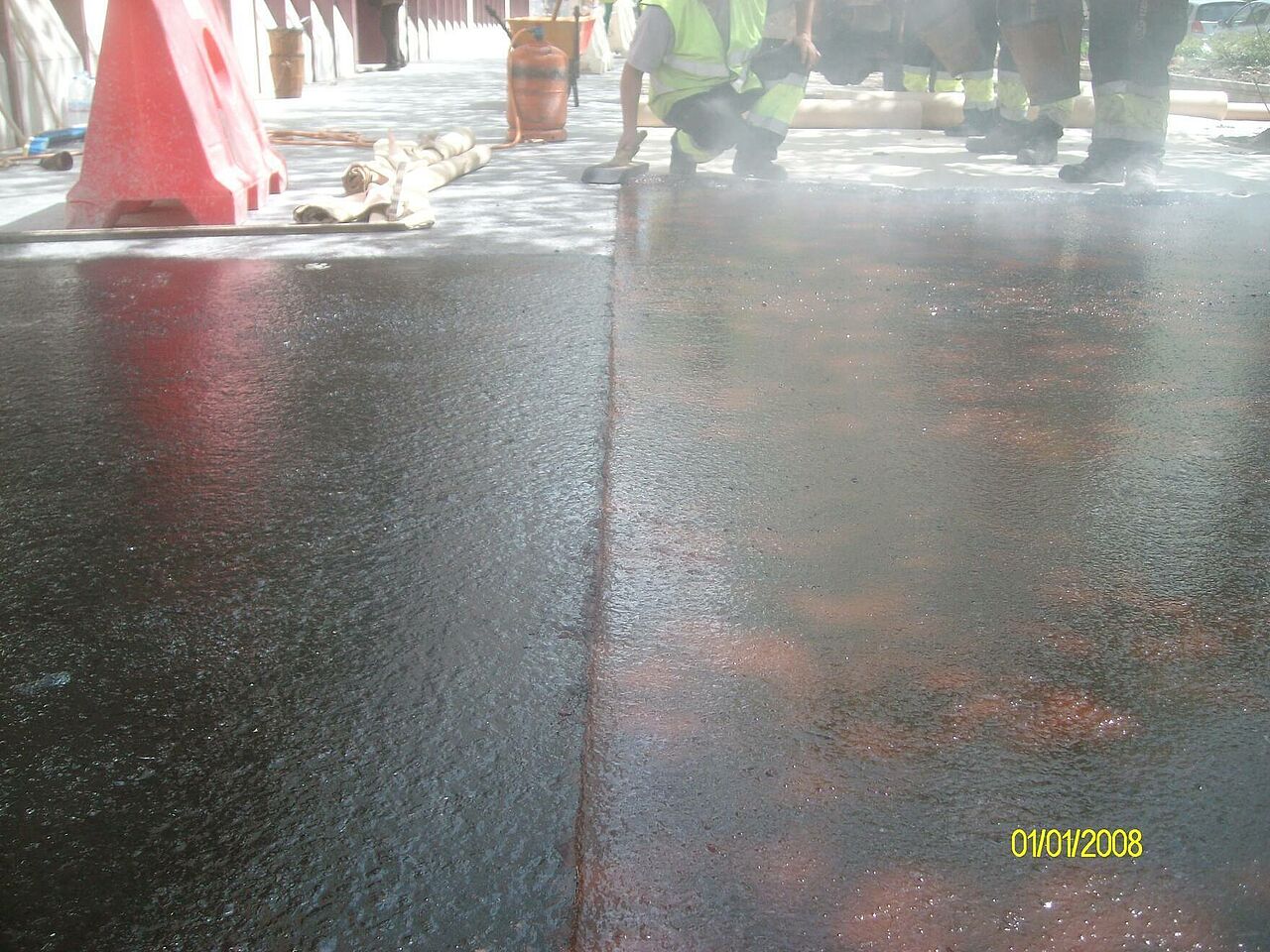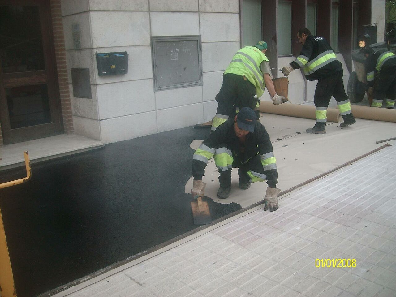 Se han ejecutado los accesos a garajes con asfalto fundido impreso y el resto con asfalto fundido de color negro y rojo y posterior pulido, ésto confiere al pavimento de un alto nivel decorativo.