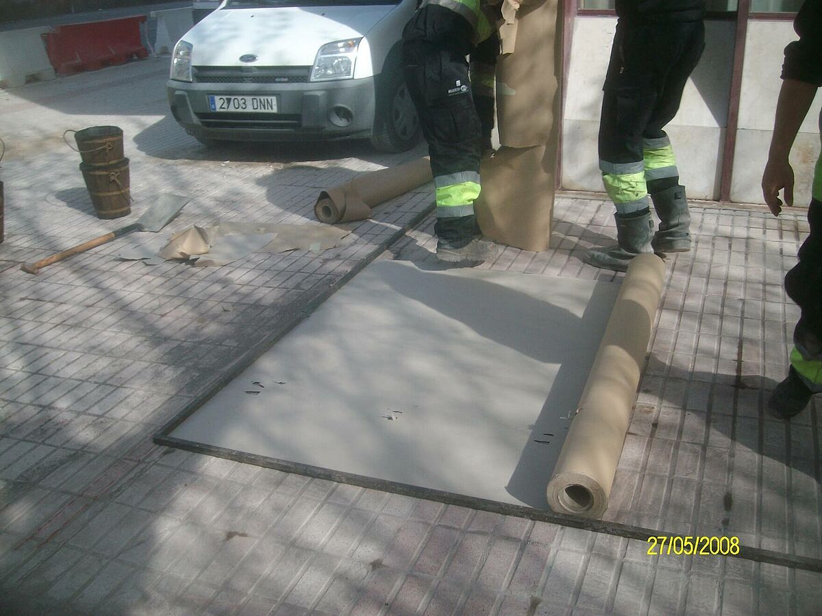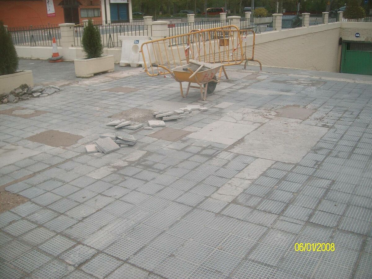 Se toma la decisión de pavimentar con asfalto fundido, ya que evita todo este tipo de actuaciones, pues se consigue la renovación completa de los pavimentos SIN DEMOLICIÓN y al ser IMPERMEABLE se eliminan las humedades existentes.